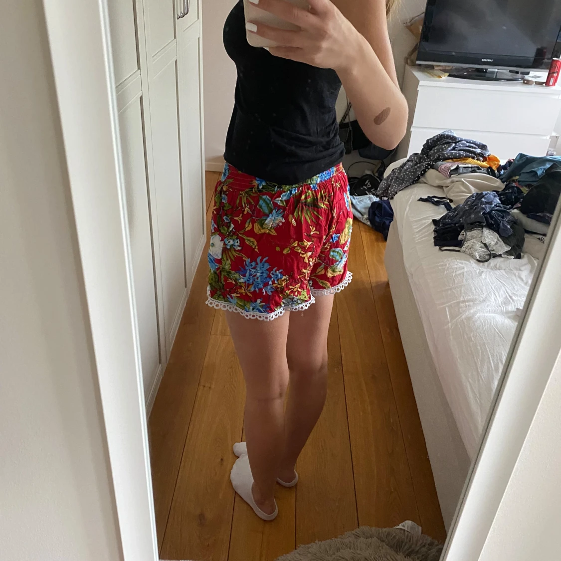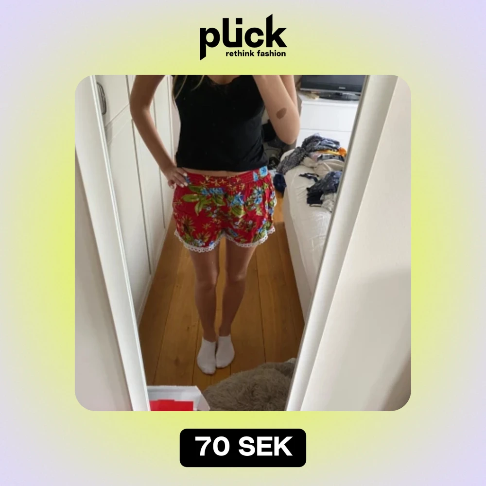 Säljer ett par superfina röda shorts med blommigt mönster och spetsdetaljer längst ner. Perfekta för sommaren! De är bekväma och har en lös passform. Passar perfekt till stranden eller en varm sommardag. 🏖️🌸köpta på marknad i Frankrike så vet därför inte märket.
