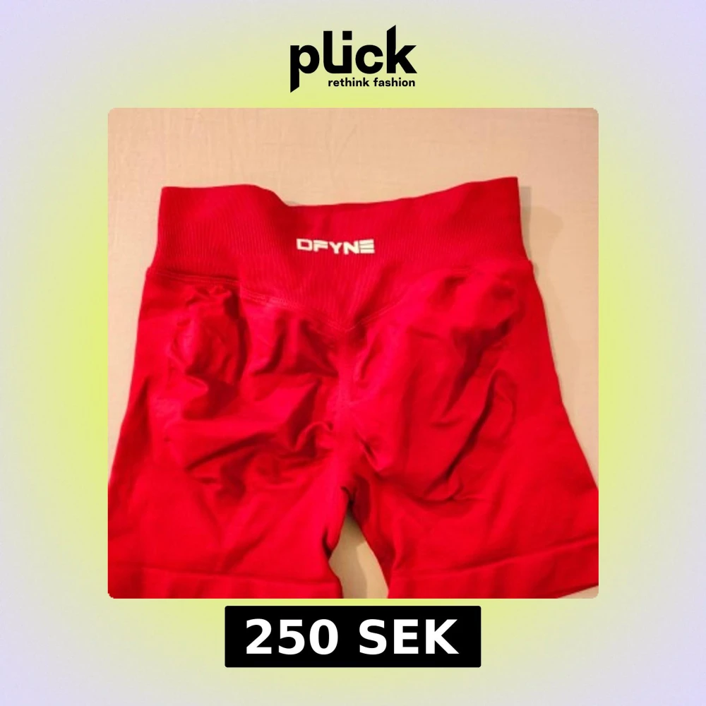 Säljer ett par röda högmidjade träningsshorts från DFYNE. De har en bred ribbad midja och är tillverkade i stretchigt material med 90% nylon och 10% elastan. Perfekta för gymmet eller andra sportaktiviteter. Snygg logga framtill och på sidan av midjan.