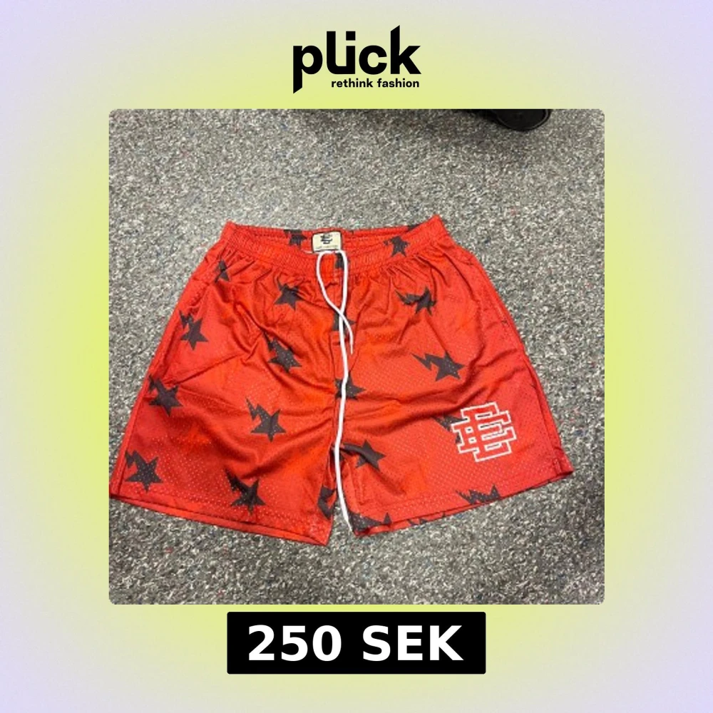 Snygga röda meshshorts från Eric Emanuel med svarta stjärnmönster och vit logga på benet. Shortsen har elastisk midja med vit snörning och är perfekta för sommaren. Luftigt material i polyester som ger en sportig vibe.