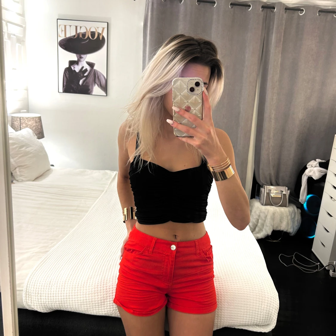 Snygga röda shorts med knapp och dragkedja framtill. Perfekta för en somrig look. De är lågmidjade och har en tight passform som framhäver figuren.