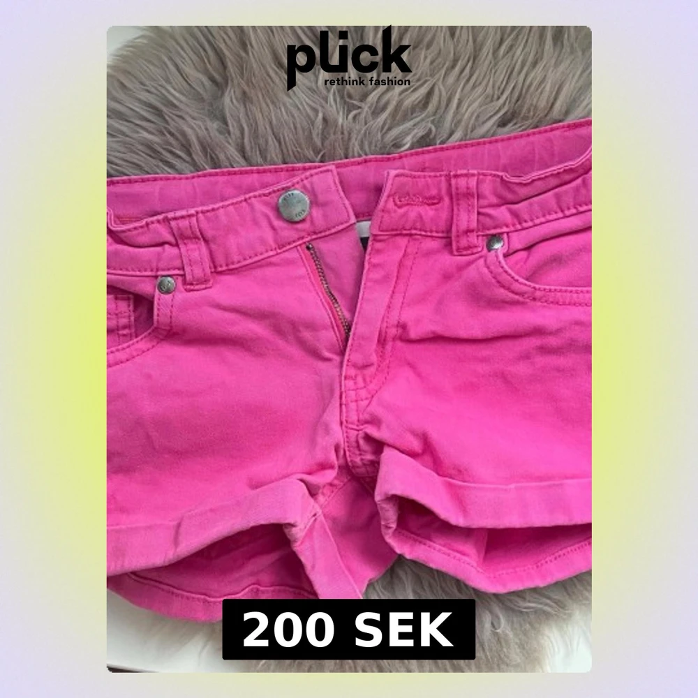 Snygga rosa jeansshorts med klassisk femficksdesign och uppvikta benslut. låren är ungefär 42cm och midjan platt 32cm
