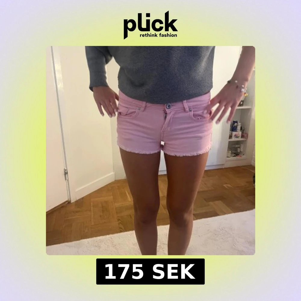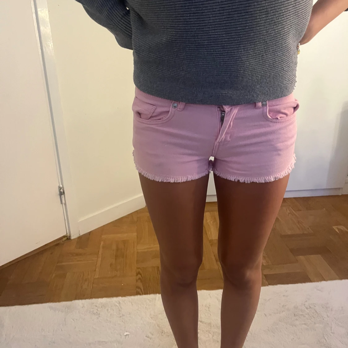 Säljer ett par ljusrosa jeansshorts med fransig kant nertill. Shortsen har klassisk femficksdesign, knapp och dragkedja framtill samt bälteshällor. Perfekta för varma dagar och ger en cool vibe till din outfit.