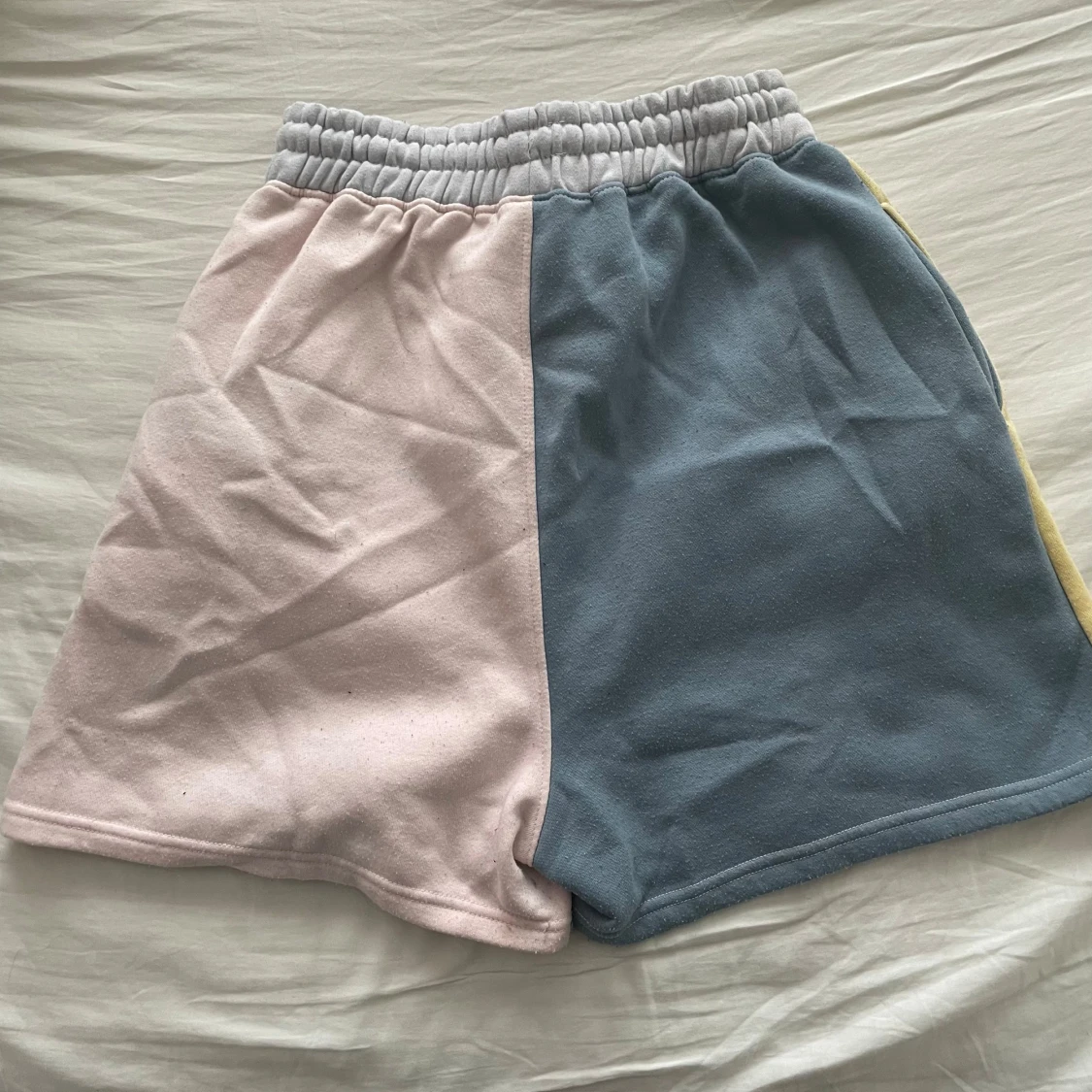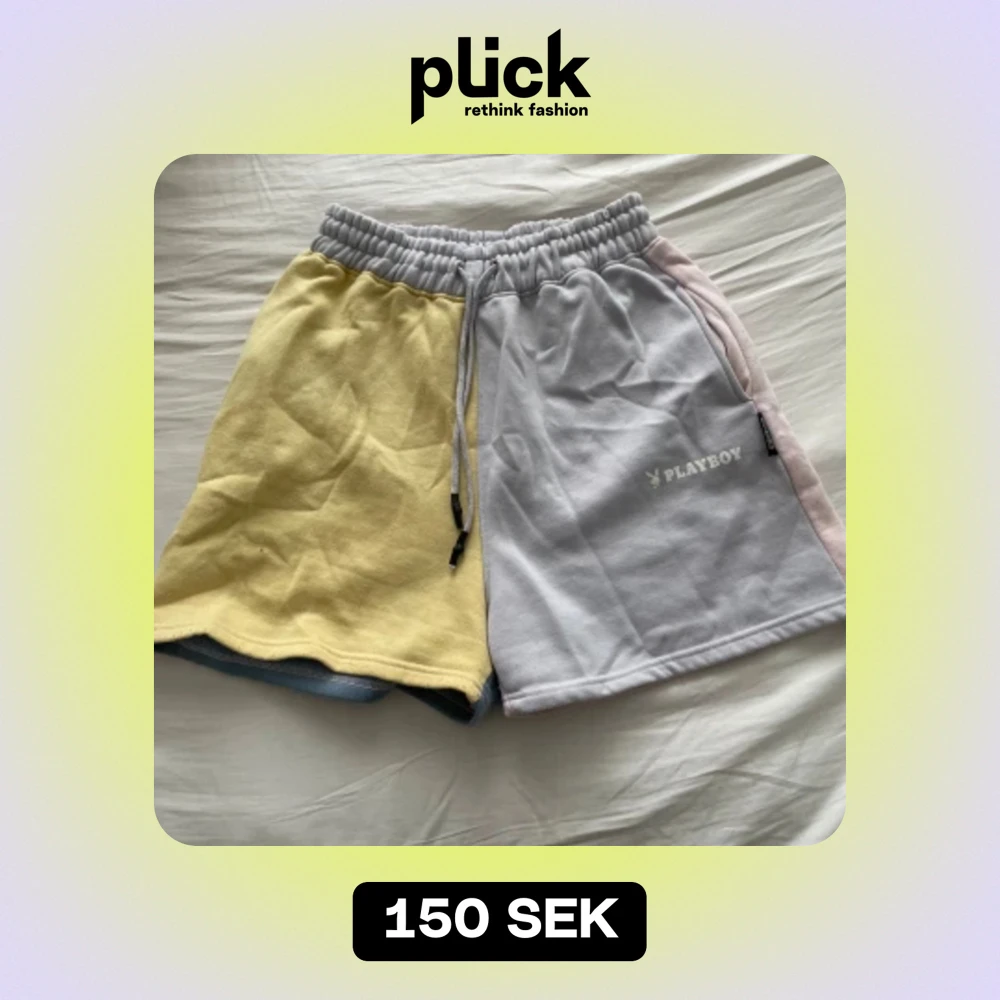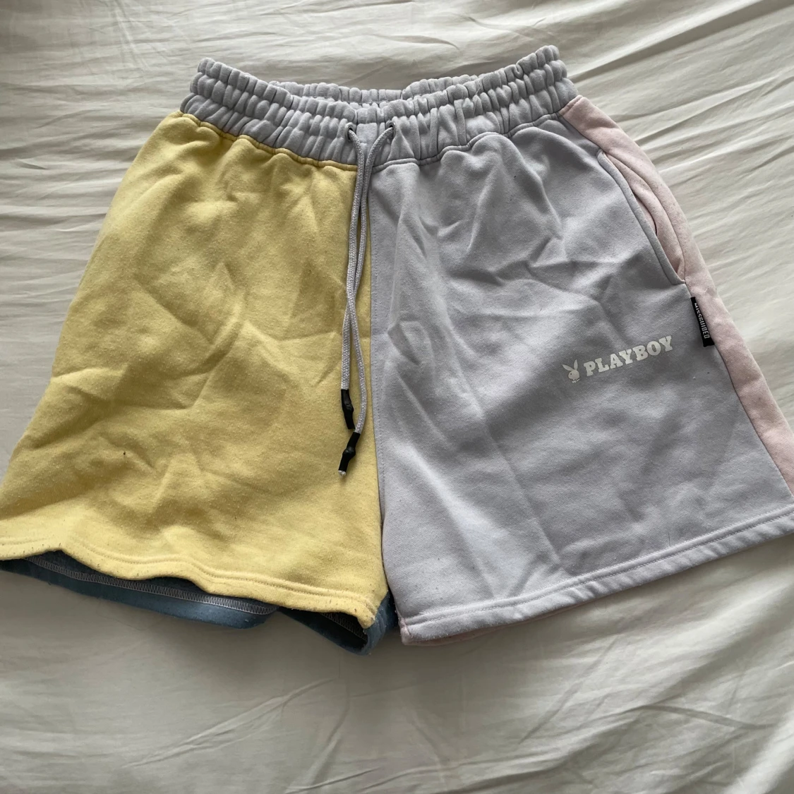 Säljer ett par unika flerfärgade shorts från Playboy. De har en cool design med olika färger på varje ben: gul, ljusgrå, rosa och blå. Shortsen har en elastisk midja med snörning för bästa passform. Perfekta för en avslappnad stil!