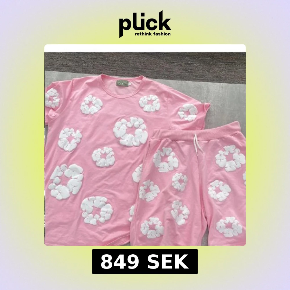 Säljer ett par rosa shorts från Denim Tears med vita blommiga mönster över hela tyget. De har en relaxed fit, resår i midjan och snörning framtill. Perfekta för en chill vibe och sticker verkligen ut med sitt unika tryck.