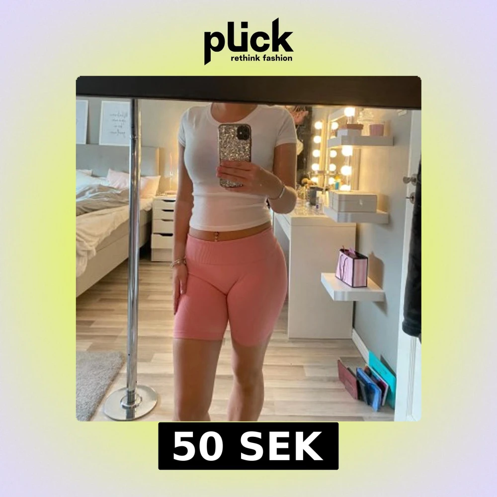 Säljer ett par ljusrosa träningsshorts från lager 157. De är högmidjade med bred ribbad linning och har en tight passform som framhäver formerna. Materialet är mjukt och stretchigt, perfekt för gymmet eller andra sportaktiviteter.