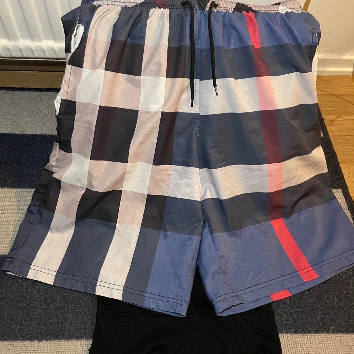 Säljer ett par snygga shorts med rutigt mönster i blått, vitt, svart och rött. De har elastisk midja och snörning framtill för extra komfort. Perfekta för chill dagar och har en modern look som sticker ut. Materialet känns lätt och skönt mot huden.