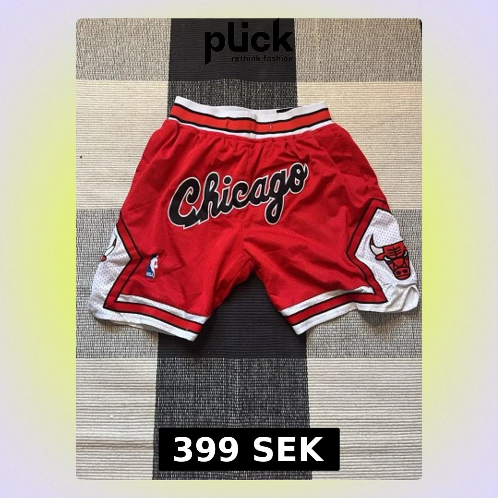 Säljer ett par röda Chicago Bulls basketshorts från Just Don med svart och vit text, samt Bulls-logga på sidorna. Shortsen har elastisk midja, vita och svarta detaljer och är tillverkade i mesh-liknande polyester. Perfekta för dig som gillar streetwear och basket.