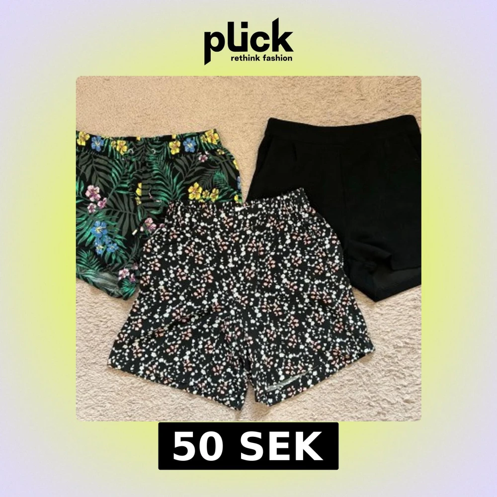 Säljer tre par shorts, ett med blommigt mönster i vitt och rosa, en helsvart och en i grönt mönster. Två av shortsen har elastisk midja och avslappnad passform, perfekta för varma dagar. Tredje shortsen har ett blixtlås på baksidan. Materialet känns mjukt och luftigt, troligen bomull eller polyester. Supersnygga till sommaren!