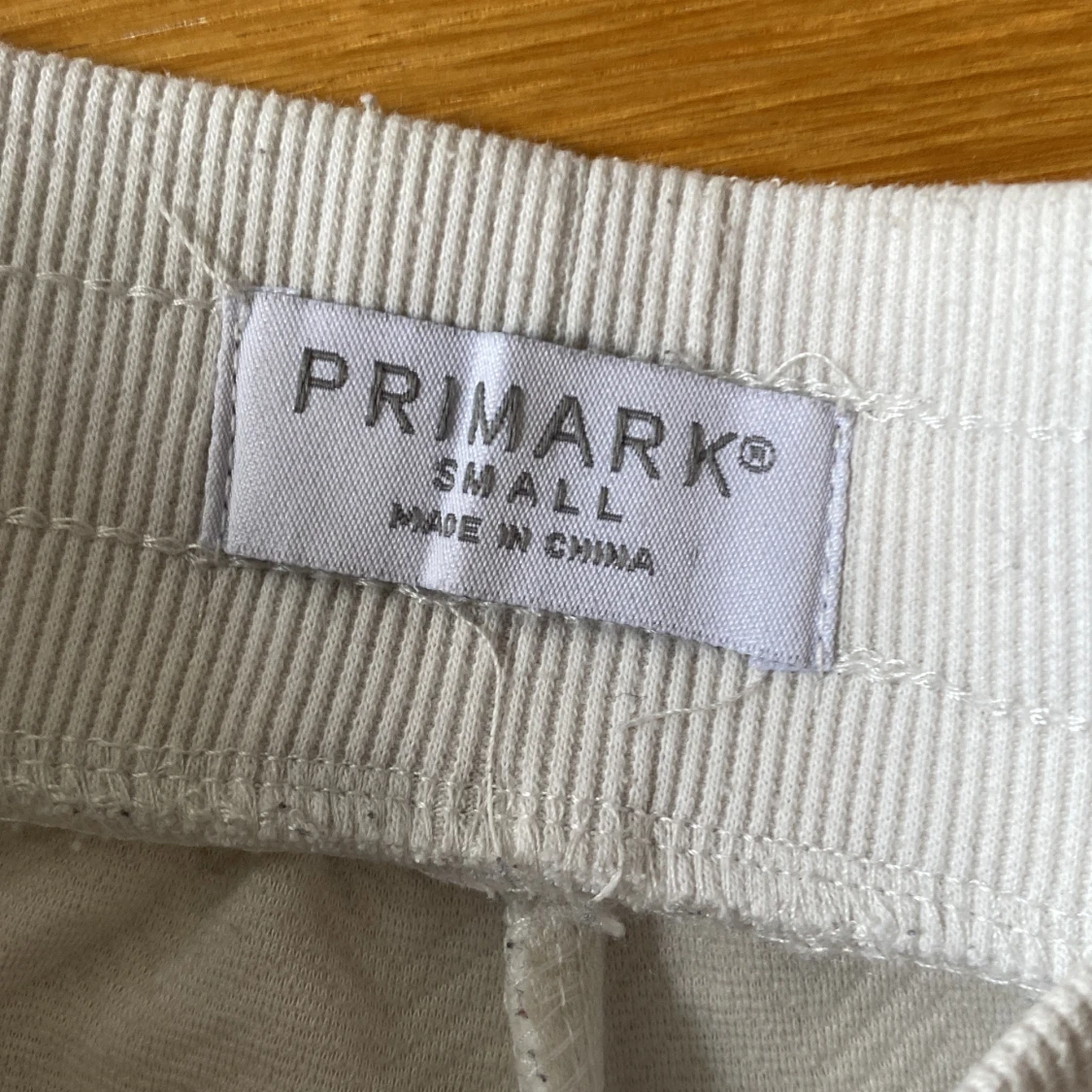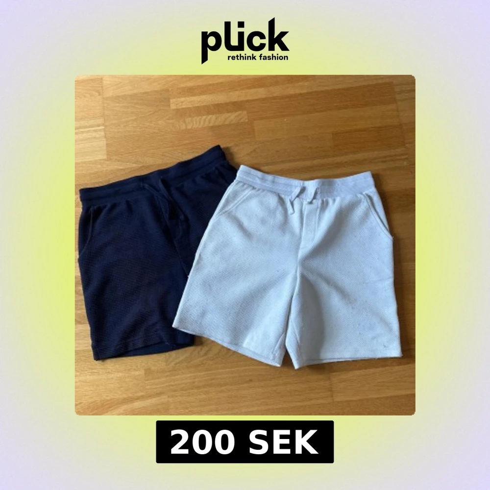 Två par shorts från Primark i storlek small. Ena paret är vitt med diskret fiskbensmönster och snörning i midjan, det andra är marinblått med enkel struktur och snörning. Båda har bekväm resårmidja och sidofickor, perfekta för chill dagar eller sommarhäng.