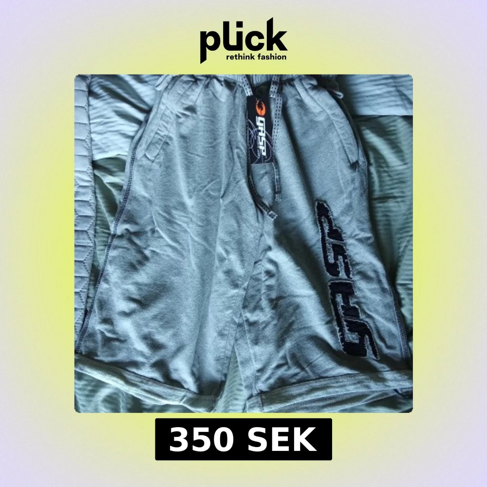 Säljer ett par grå shorts från GASP med elastisk midja och snörning. De har en avslappnad passform och ett tryck längs ena benet. Perfekta för träning eller en chill dag.