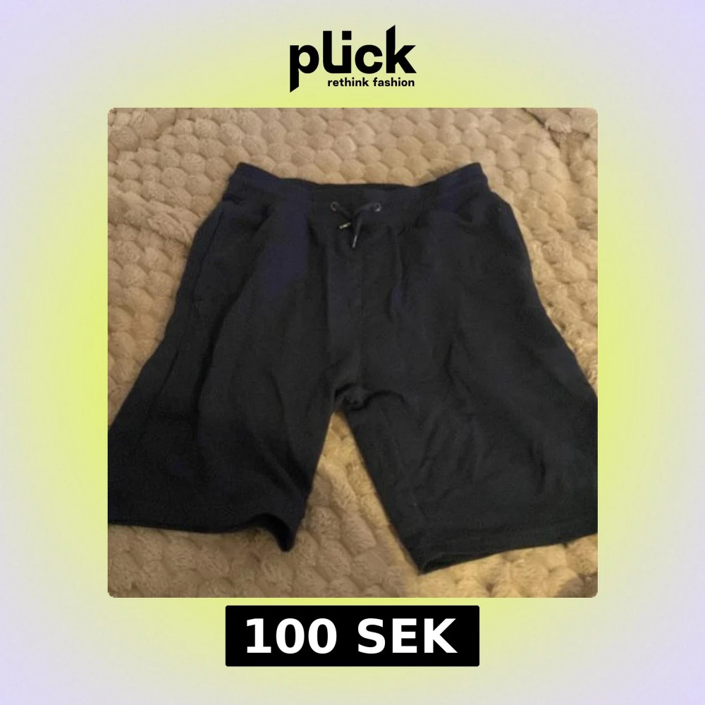 Säljer ett par mörkblå shorts med skön passform och snörning i midjan. De har praktiska sidofickor och en bakficka. Materialet är mjukt och känns som bomull, perfekt för chill dagar eller träning. Enkla och stilrena, passar dig som gillar basic och comfy.