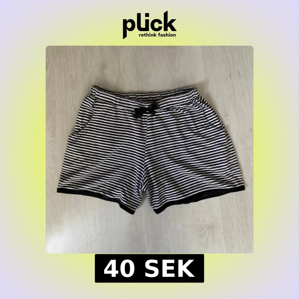 Svarta och vita shorts med smala horisontella ränder och en söt svart rosett framtill i midjan. De har elastisk midja och två sidofickor. Materialet känns mjukt och lätt, perfekt för chill dagar. Svarta kantdetaljer nedtill ger en clean look.