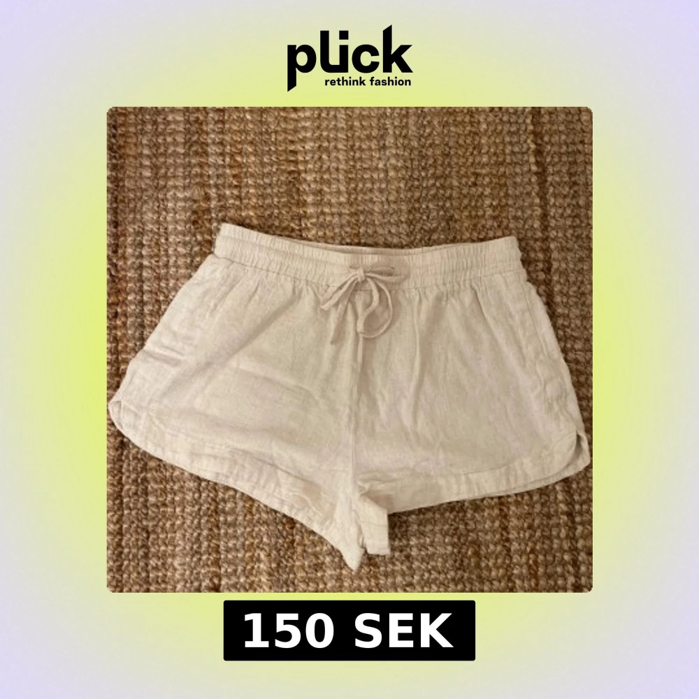 Snygga beige shorts i linne med elastisk midja och knytband. Perfekta för varma sommardagar med en avslappnad passform. De har en enkel och stilren design som gör dem lätta att matcha med olika toppar. Kan mötas upp i Stockholm eller skickas mot fraktkostnad.