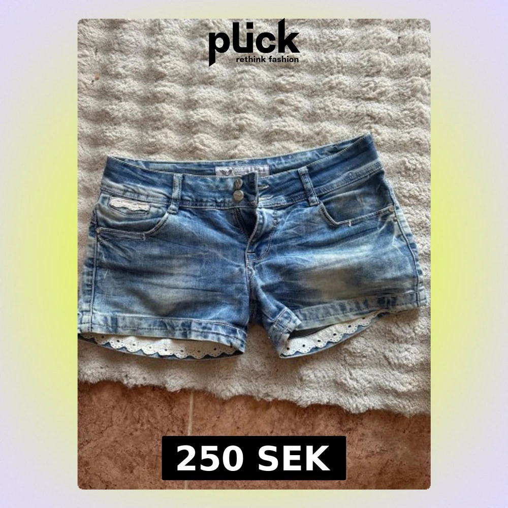 Säljer ett par blå jeansshorts från Tally Weijl med snygg slitning och vita spetsdetaljer längs bensluten. Shortsen har fem fickor, bälteshällor och stängs med dubbla knappar och dragkedja. Perfekta för sommaren!