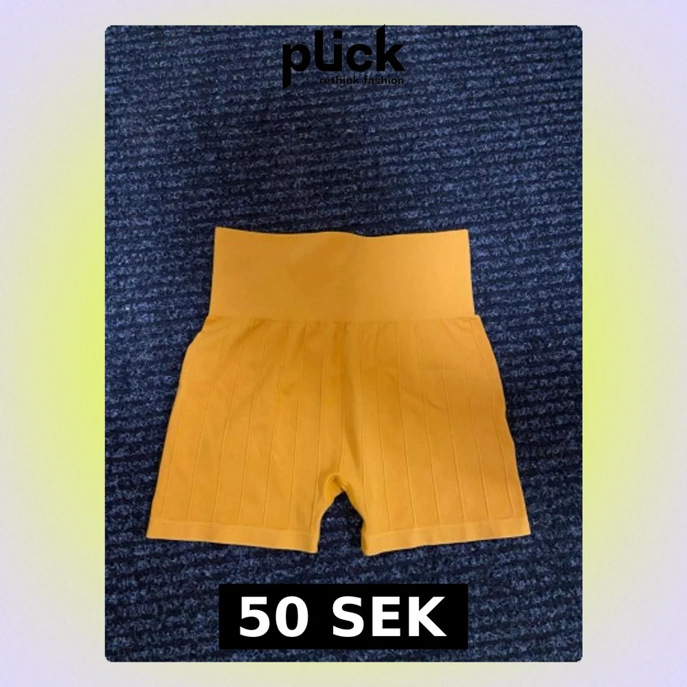 Säljer ett par orangegula cykelshorts från H&M Sport i storlek S. Helt nya och oanvända. De har hög midja och ribbade vertikala ränder som ger en snygg struktur. Materialet är stretchigt med 92% polyamid och 8% elastan, perfekt för träning eller chill. Den breda mudden håller in magen.