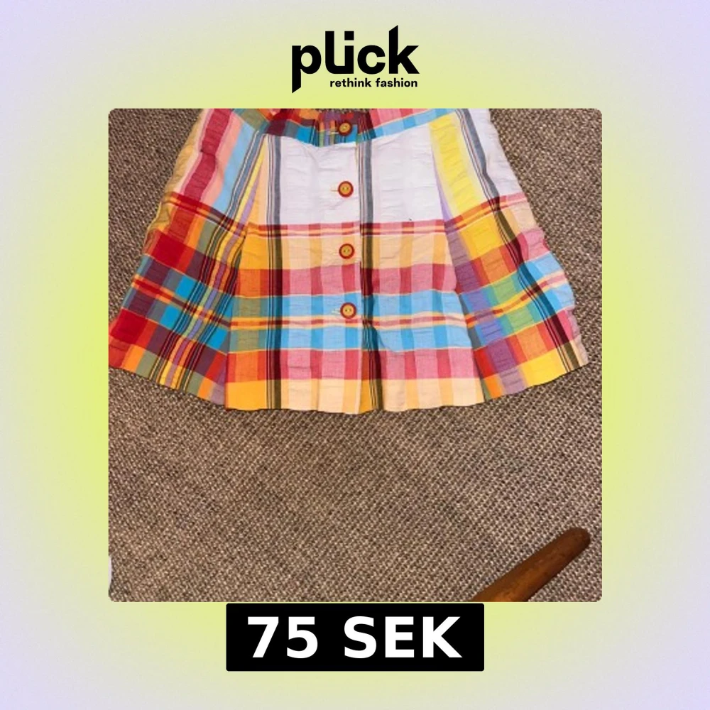 Superfin kortkjol i bomull med färgglatt rutigt mönster i rött, blått, gult och vitt. Kjolen har fyra röda och gula knappar framtill som snygg detalj. Perfekt för dig som vill sticka ut med en lekfull och somrig stil.