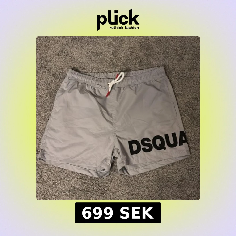 Snygga grå badshorts från DSQUARED2 med svart logotyp-tryck runt benen. Shortsen har elastisk midja med vit snörning och röda detaljer samt innerbyxa i mesh. Perfekta för stranden eller poolen, riktigt clean look. OBS:sitter som xs, ganska korta