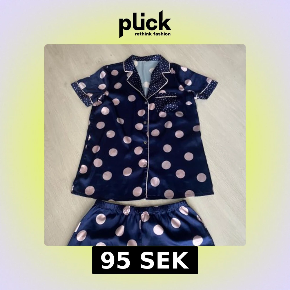 Snygga mörkblå pyjamasshorts i glansigt satinmaterial med stora ljusbeiga prickar. Shortsen har elastisk midja och kontrasterande småprickiga detaljer vid benslut. Perfekta för en chill kväll hemma.