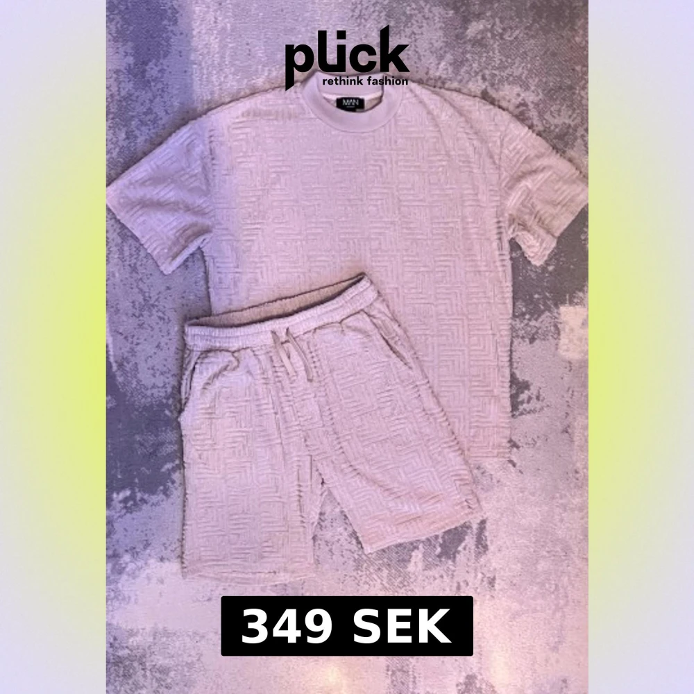 Säljer ett snyggt beige sett med shorts och t shirt från bohooMAN med snyggt strukturerat mönster och resår i midjan med snörning. Settet är i relaxed fit.