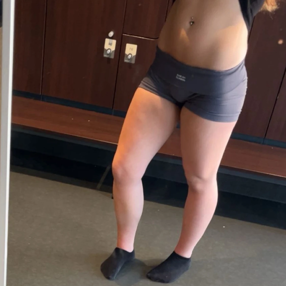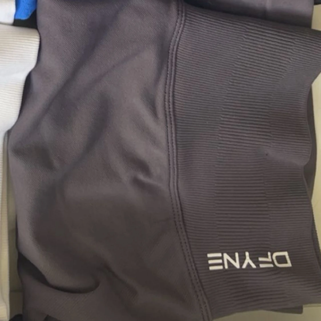 Säljer ett par grå, supertighta träningsshorts. De har låg midja och är gjorda i ett stretchigt syntetmaterial som sitter perfekt under gympasset. Shortsen har en diskret logga framtill och ribbade detaljer på sidorna för extra stil.