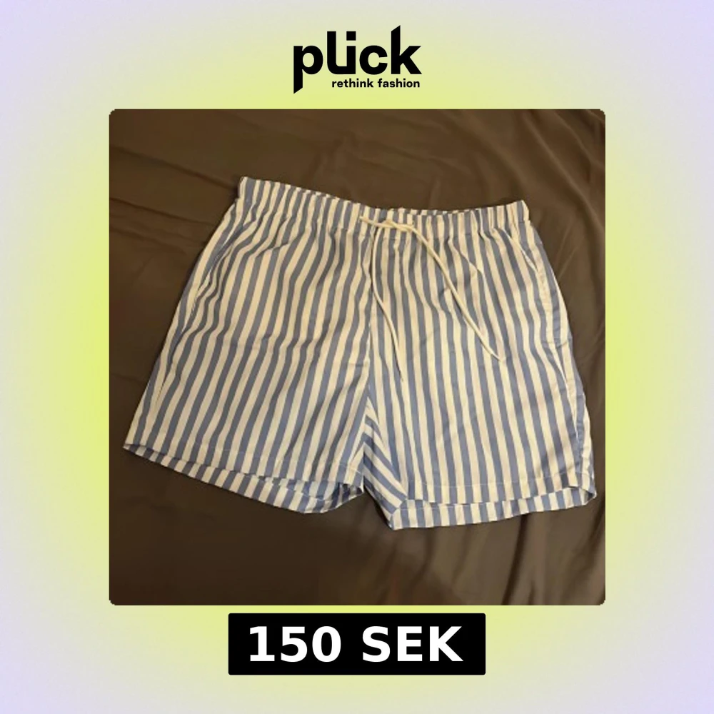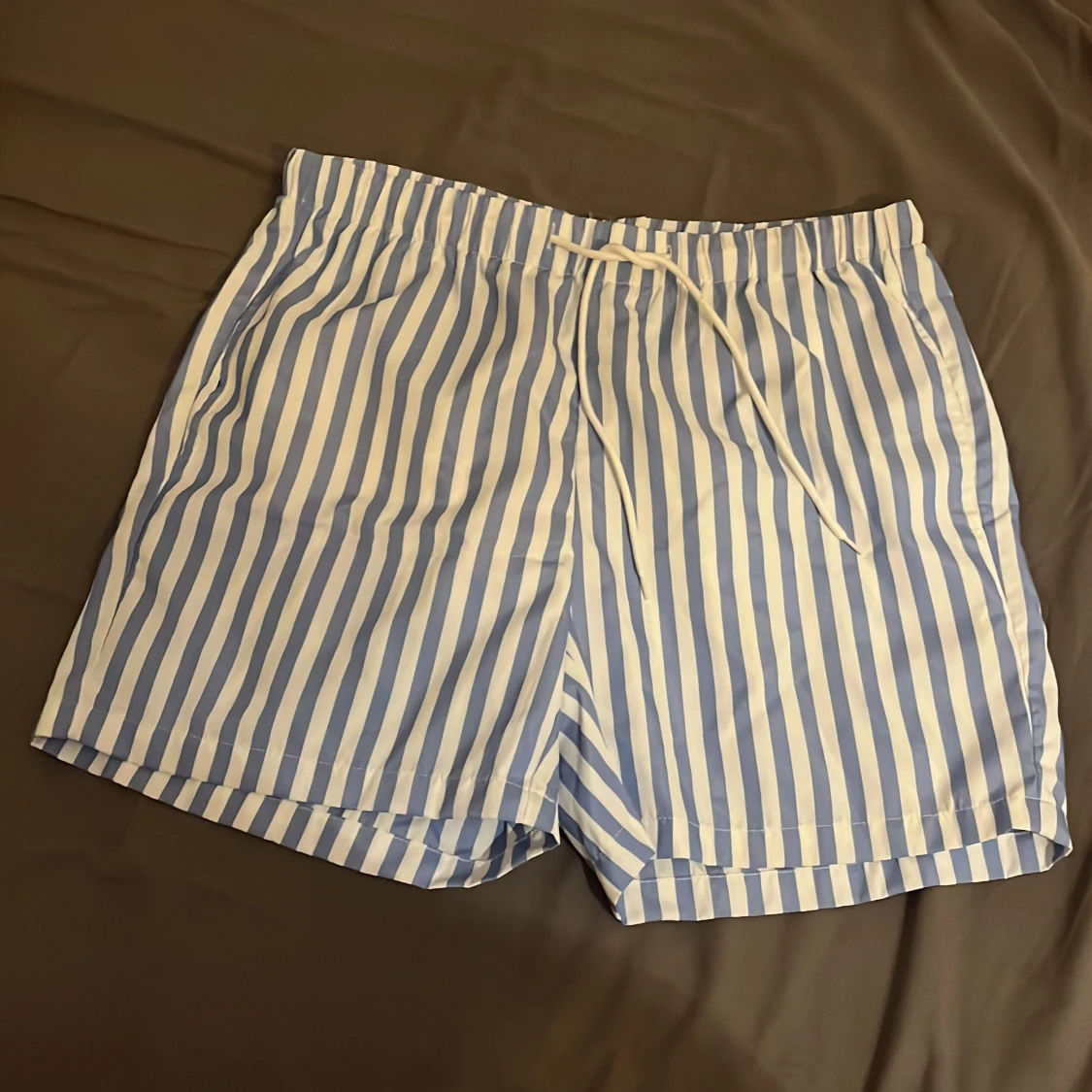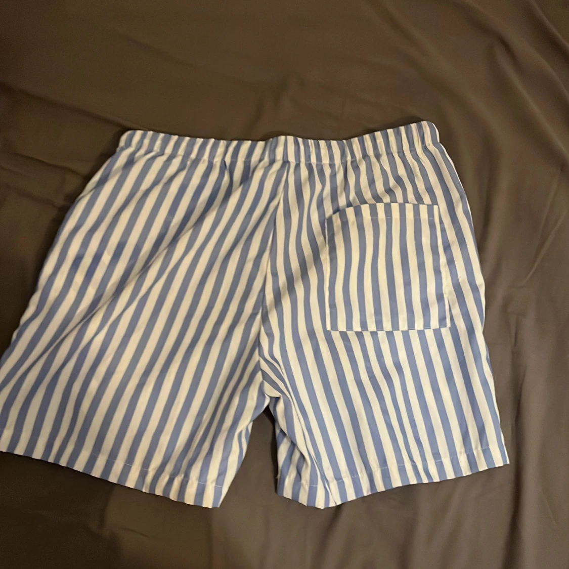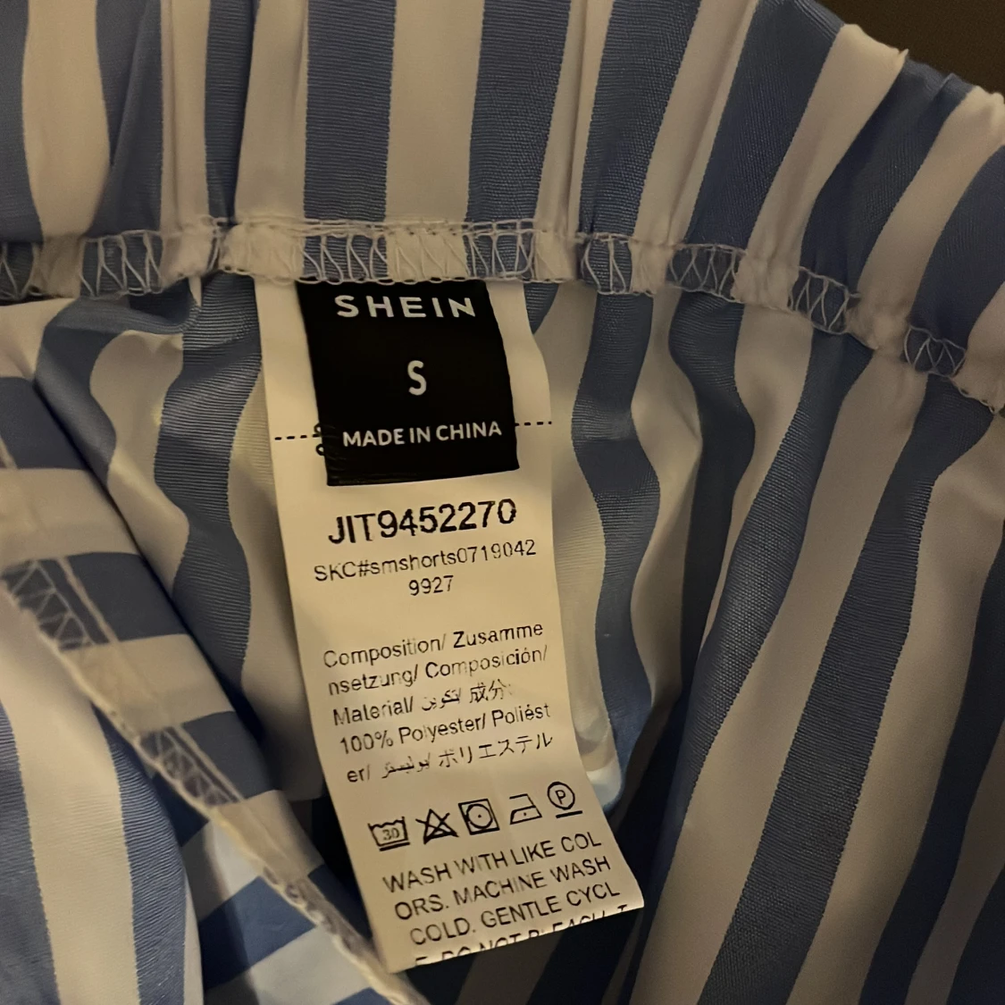 Snygga blå- och vitrandiga shorts från Shein i storlek S. De är tillverkade av 100% polyester och har en bekväm passform med snörning i midjan. Perfekta för en avslappnad stil.