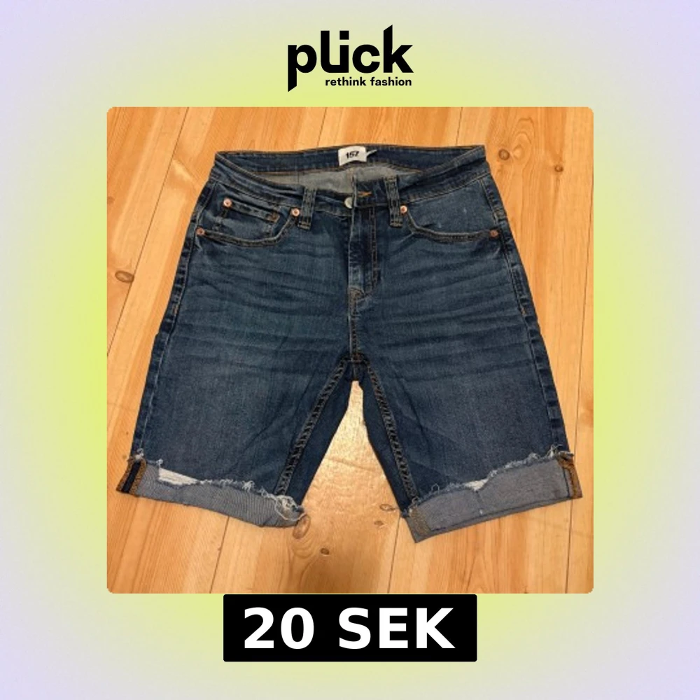 Säljer ett par klassiska blå jeansshorts från 157 med upprullade och fransade benslut. Shortsen har fem fickor, knappgylf och normal passform. Perfekta för sommaren!
