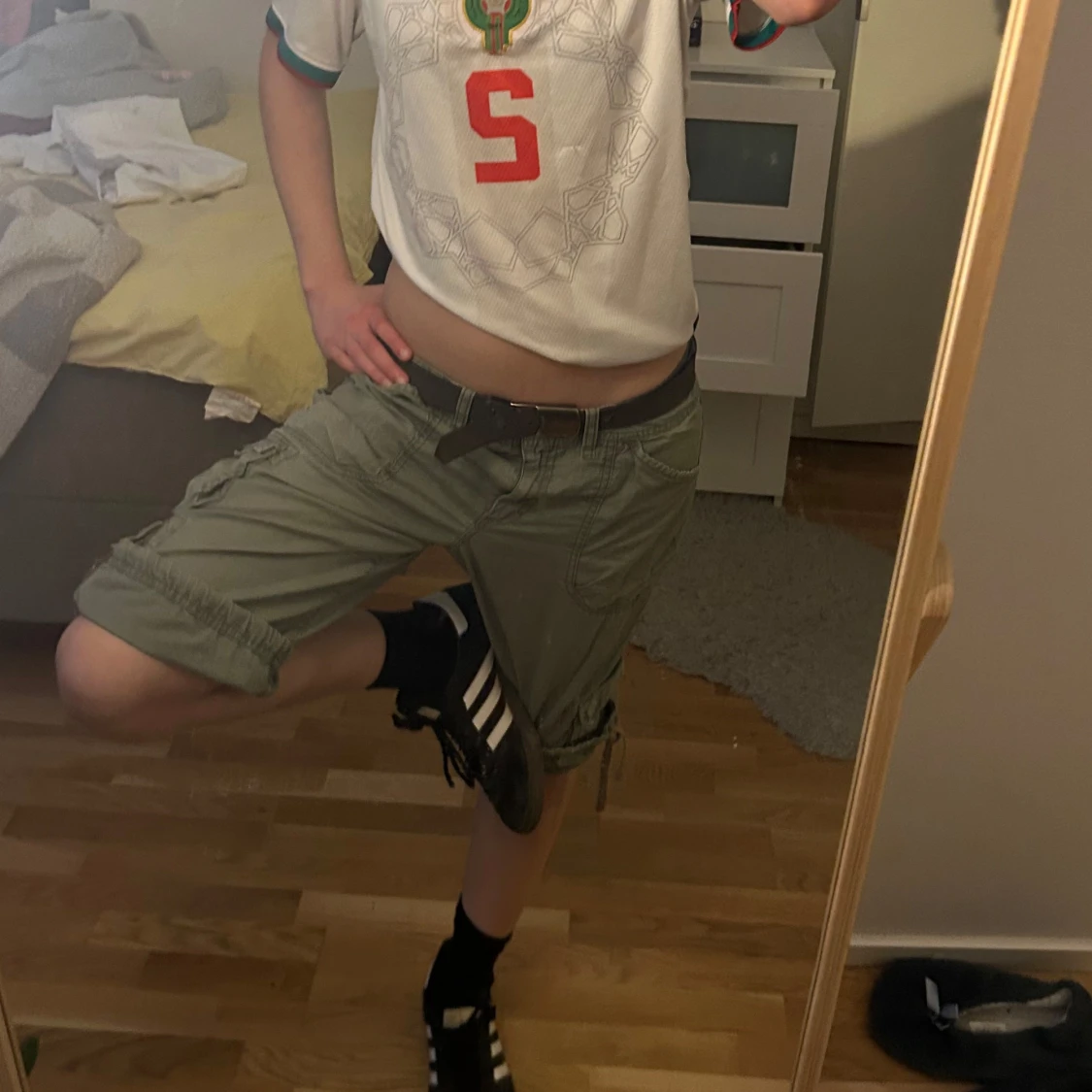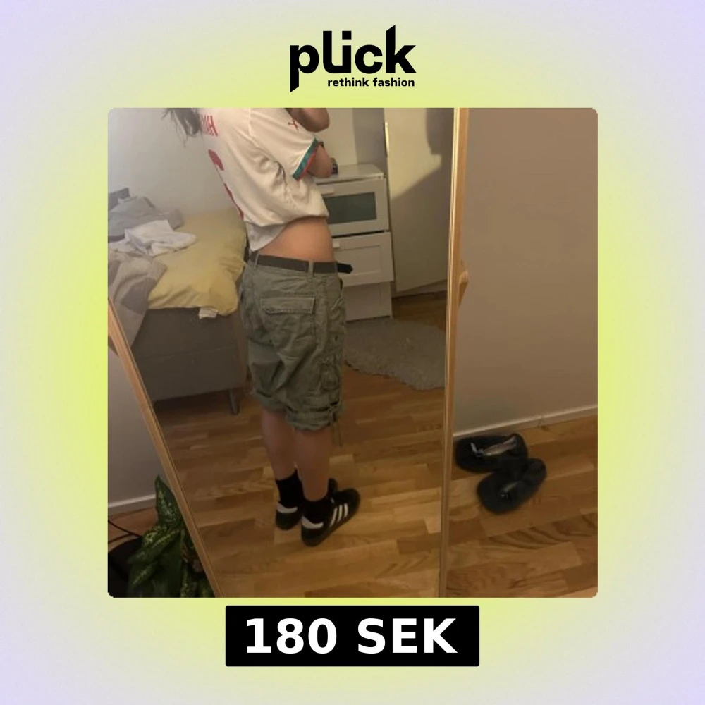 Säljer ett par gröna cargo shorts med flera fickor och coola snörningsdetaljer vid bensluten. De har låg midja och är tillverkade i ett slitstarkt bomullsmaterial. Perfekt för dig som gillar streetstyle.