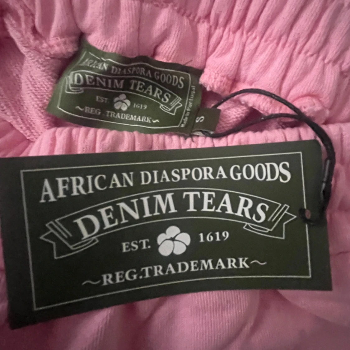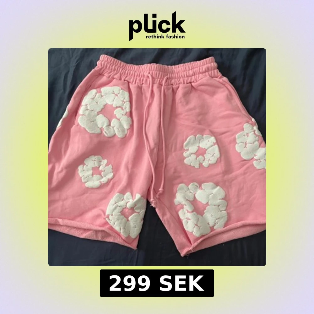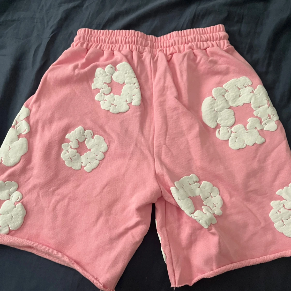Säljer ett par rosa shorts från Denim Tears med vita, upphöjda blommönster över hela plagget. De har elastisk midja med snörning och är tillverkade i mjuk bomull. Perfekta för dig som gillar statement-plagg och vill sticka ut med cool design.