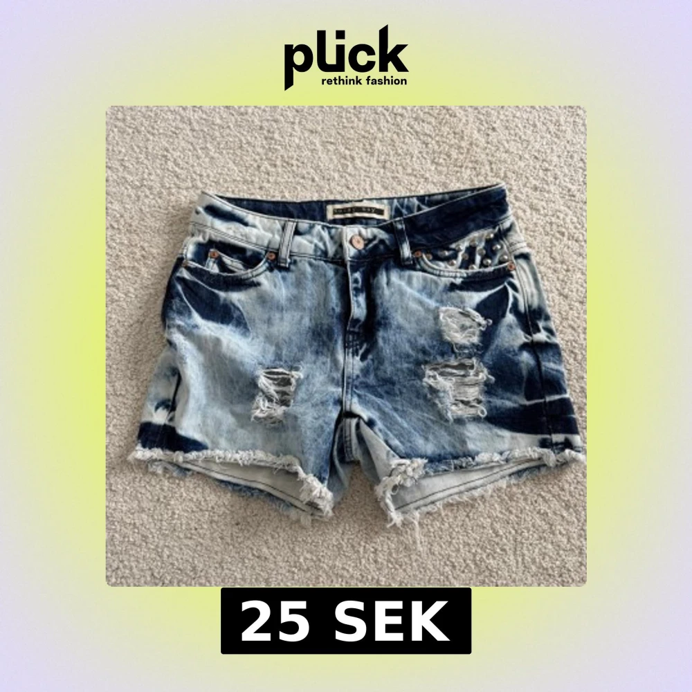 Säljer ett par blå jeansshorts från Noisy May med cool tie-dye effekt och slitna detaljer framtill. Shortsen har råa kanter, nitar vid fickan och klassisk femficksmodell. Perfekta för sommaren och ger en avslappnad vibe.