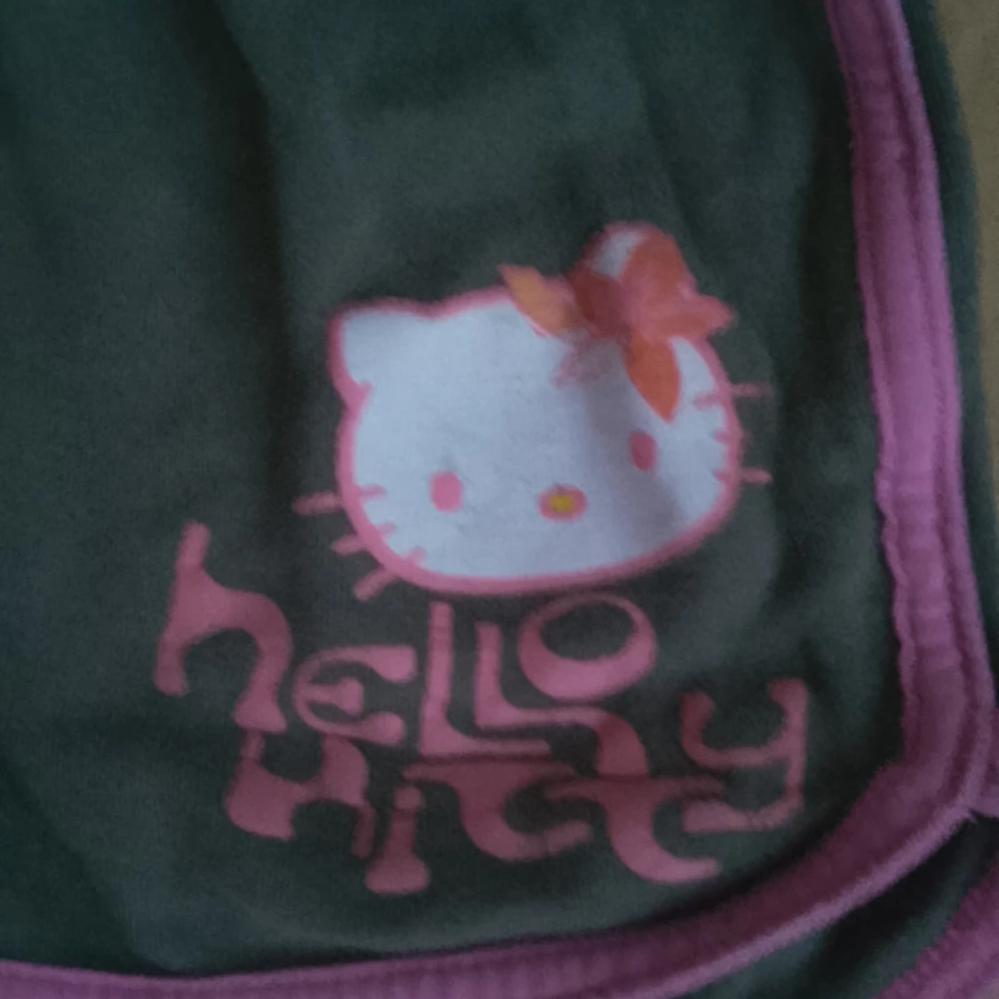 Mörkgröna shorts med rosa kant och Hello Kitty-tryck framtill. Söt design med kontrasterande färger och en liten rosett på trycket. Perfekt för dig som gillar kawaii och vill ha något unikt i garderoben. Mjukt material som känns skönt mot huden.