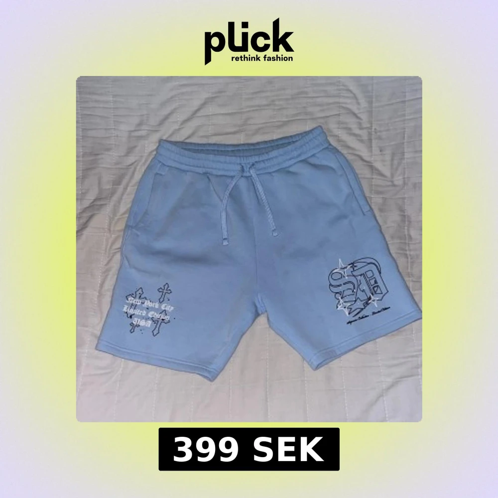 Snygga ljusblå shorts från Supply & Demand New York City med coolt tryck och grafiska detaljer på båda benen. De har elastisk midja med snörning och är gjorda i mjuk bomull, perfekta för chill dagar. Fickor på sidorna för extra funktion.
