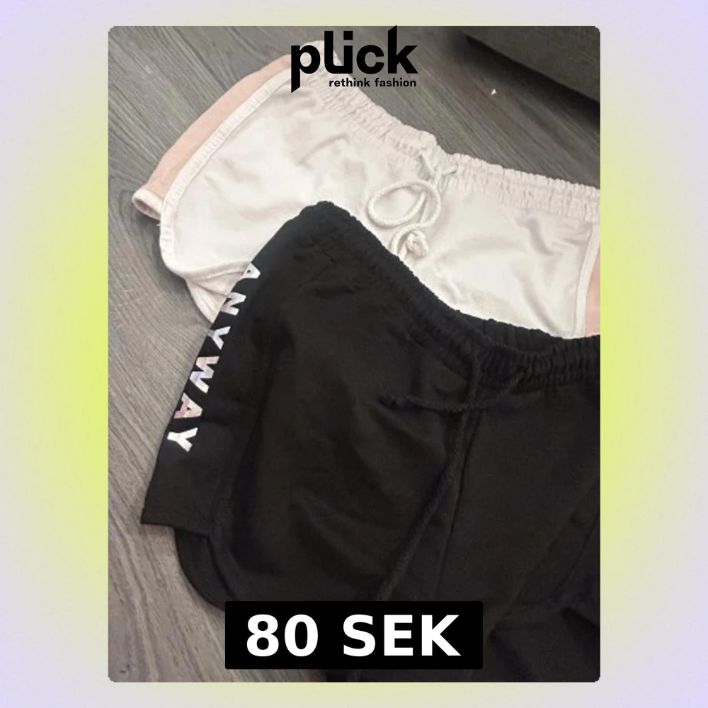 Två par sportiga shorts från ANYWAY, ett par i svart med silvertext och ett par i vitt med ljusrosa sidor och guldtext. Båda har elastisk midja och snörning för skön passform. Perfekta för träning eller chill. Mjukt bomullsmaterial och kort modell.