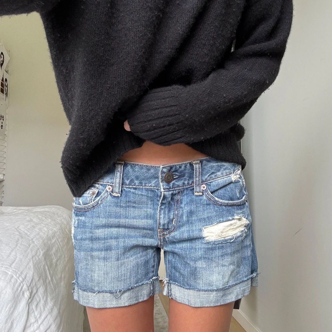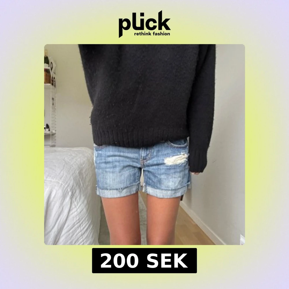 Snygga blå jeansshorts med låg midja och coola slitningar på framsidan. De har klassiska fem fickor, uppvikta ben och råa kanter för en avslappnad vibe. Perfekta för varma dagar och passar till allt. Jeansmaterialet är mjukt och bekvämt.