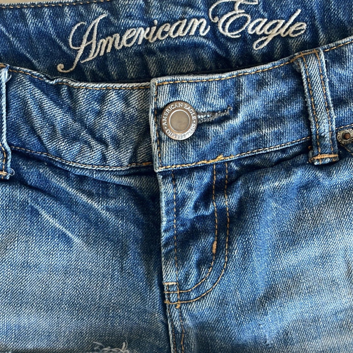 Snygga blå jeansshorts från American Eagle med slitna detaljer och fransig kant. Klassisk femficksmodell med låg midja och uppvikta ben med randigt innerfoder. Perfekta för sommaren och chill dagar.