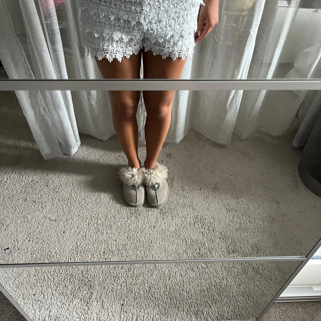 Säljer ett par vita shorts med vacker spets och volangdetaljer. Shortsen har en bred midja och är dekorerade med blommönstrad spets som ger en romantisk känsla. Perfekta för sommaren och riktigt sköna att bära.