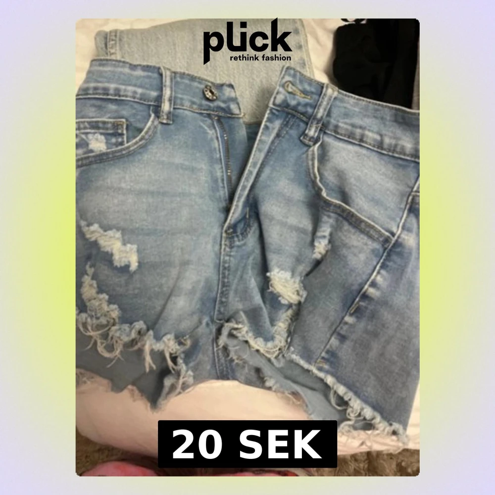 Säljer ett par ljusblå jeansshorts med slitna detaljer och fransig kant. Shortsen har klassisk femficksmodell, bälteshällor och dragkedja framtill. Perfekta för sommaren och ger en avslappnad streetstyle-look.