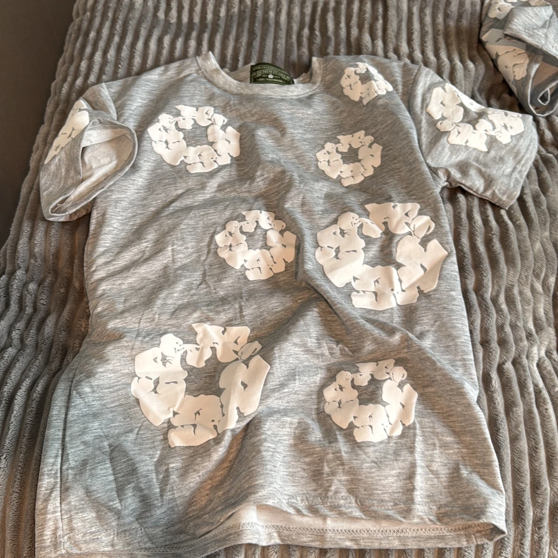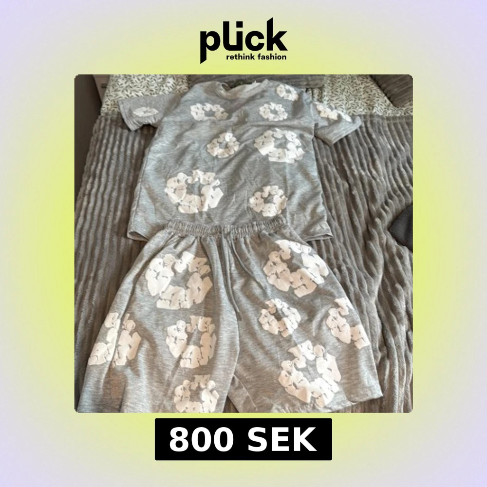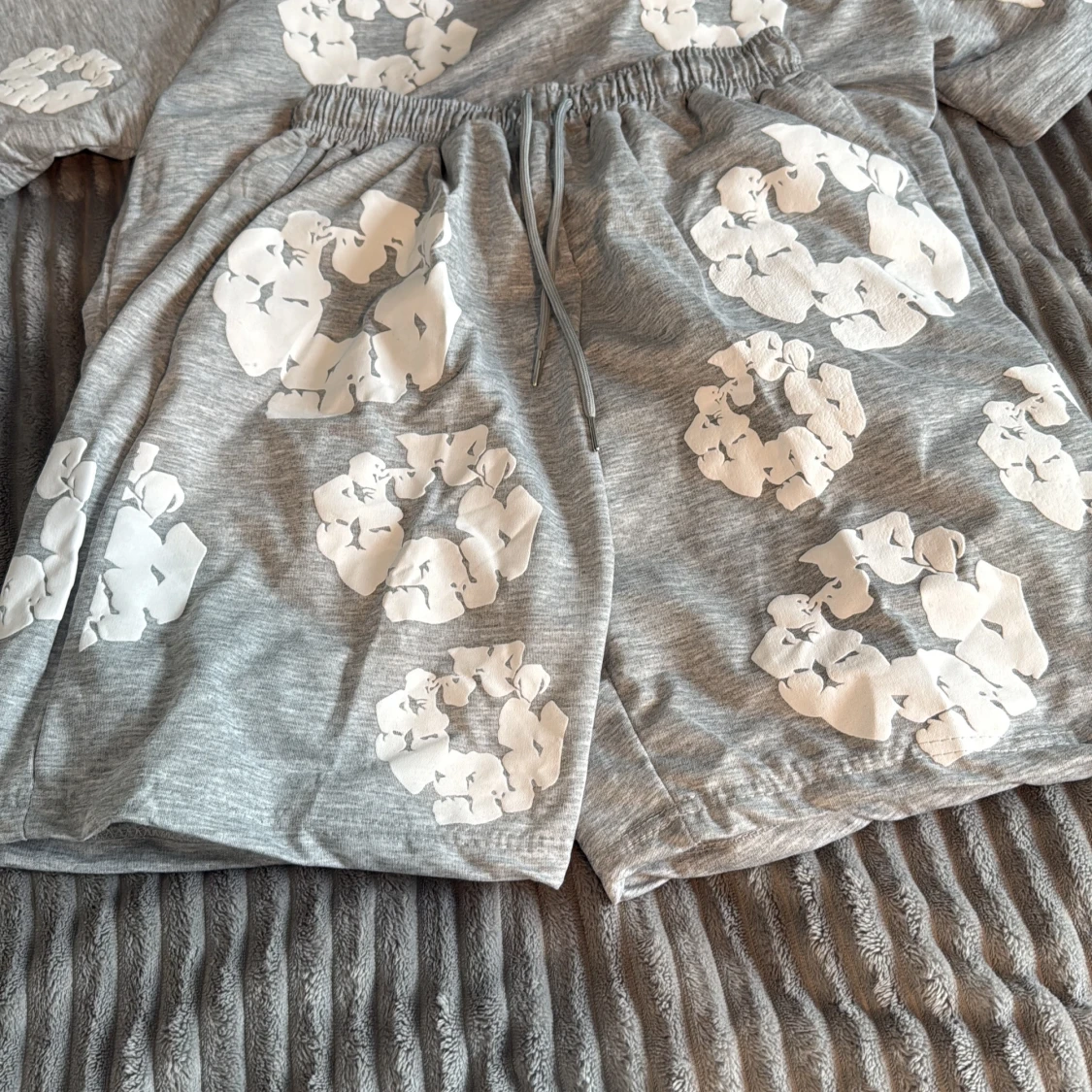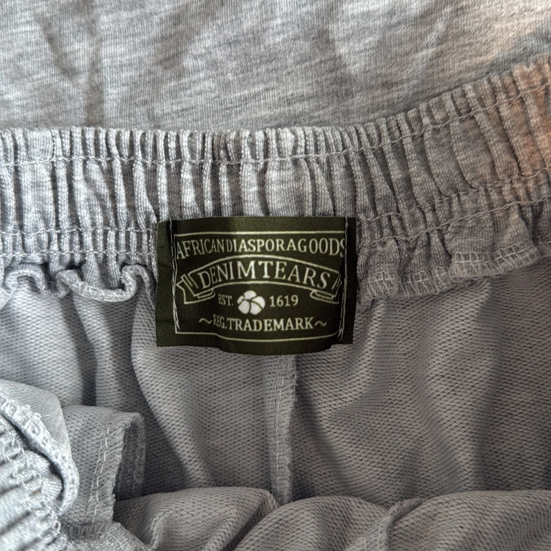 Grå shorts från Denim Tears med elastisk midja och snörning. De har ett unikt vitt blommigt tryck över hela tyget som ger en cool och avslappnad vibe. Perfekta för sommaren och riktigt sköna tack vare mjukt bomullsmaterial.