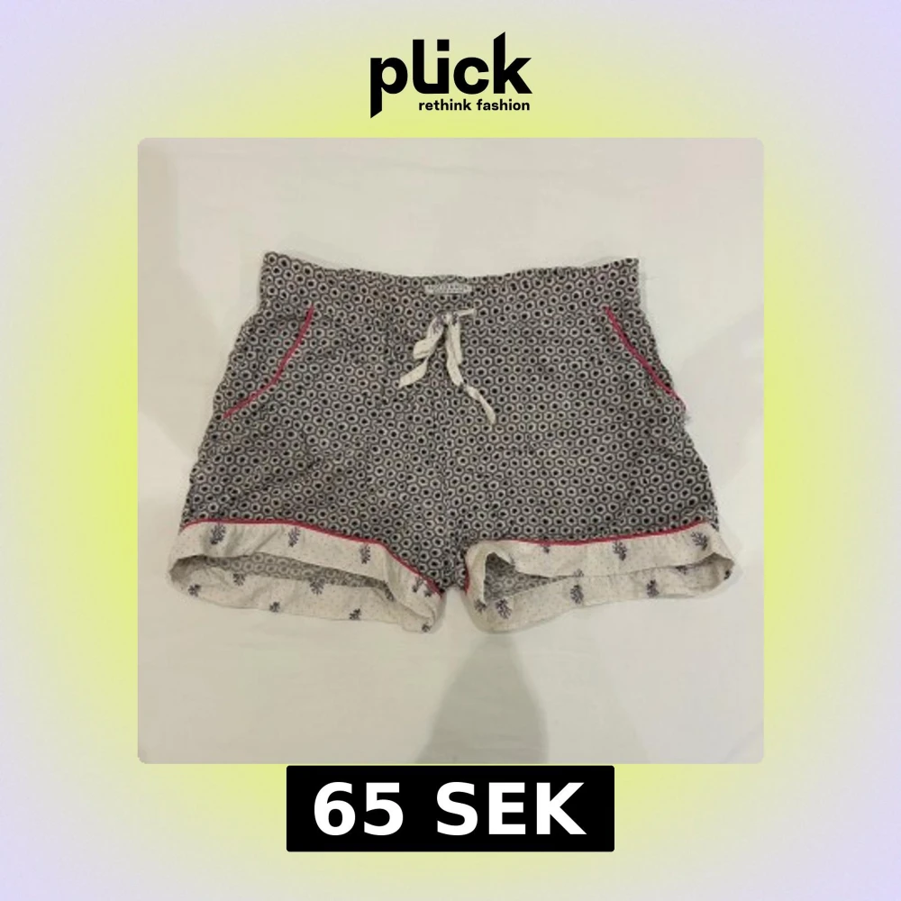 Snygga pyjamas shorts från Scotch & Soda med svart och vit geometriskt mönster, kontrasterande rosa kant och snörning i midjan. Uppvikta ben med ljusare tyg och små tryckta motiv.