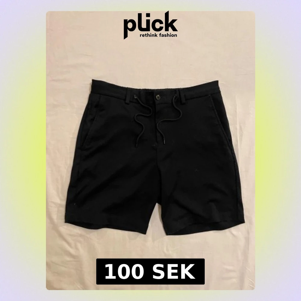 Svarta shorts från Selected Homme med snörning i midjan, knappstängning och bälteshällor. Klassisk rak modell med fickor fram och bak, samt elastisk del baktill i midjan. Perfekta för varma dagar och stilrena outfits.