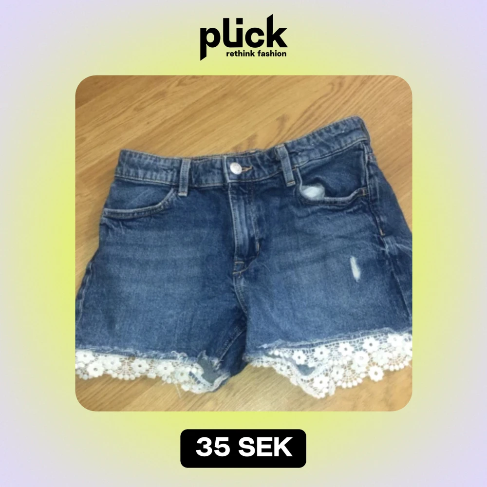 Shortsen är mörkblåa och har fickor där bak. Shortsen har också vita blommor längst ner.