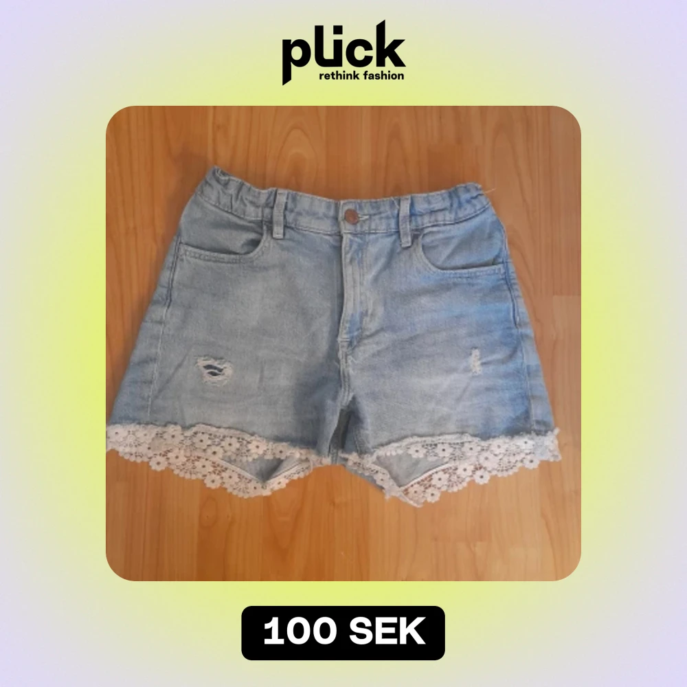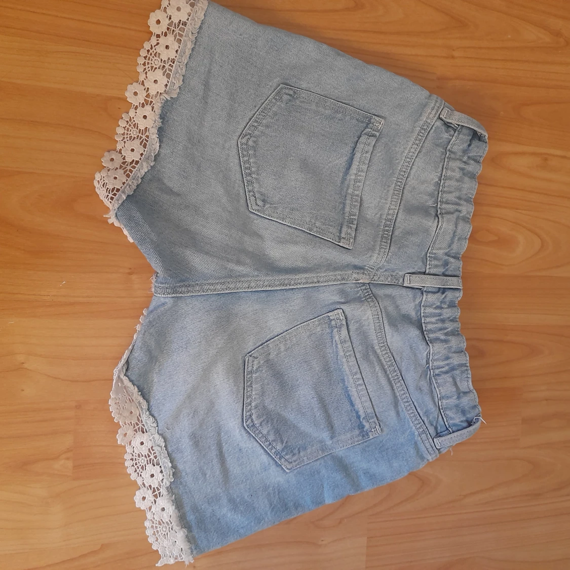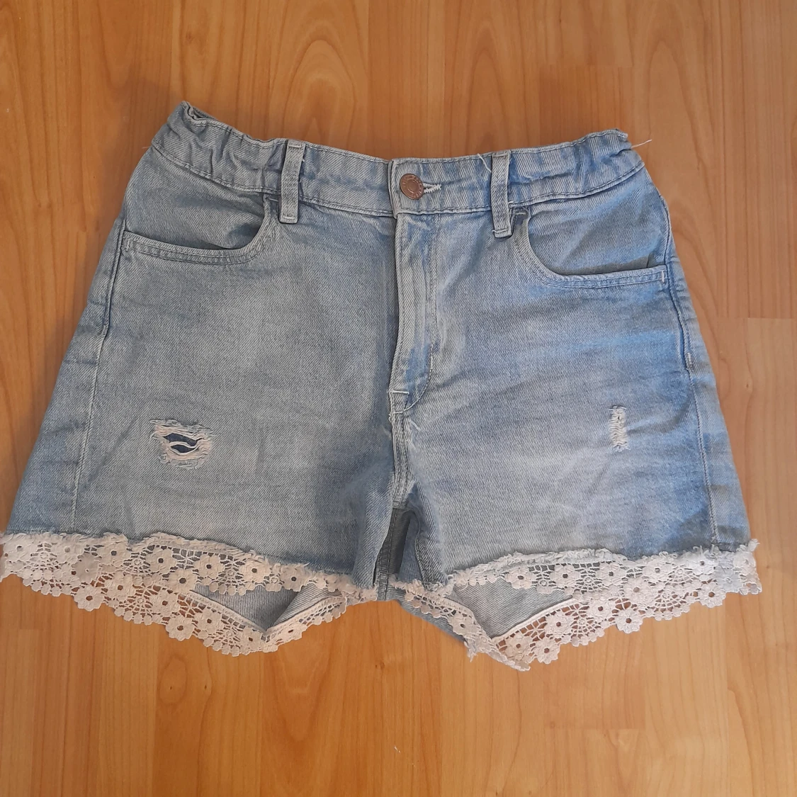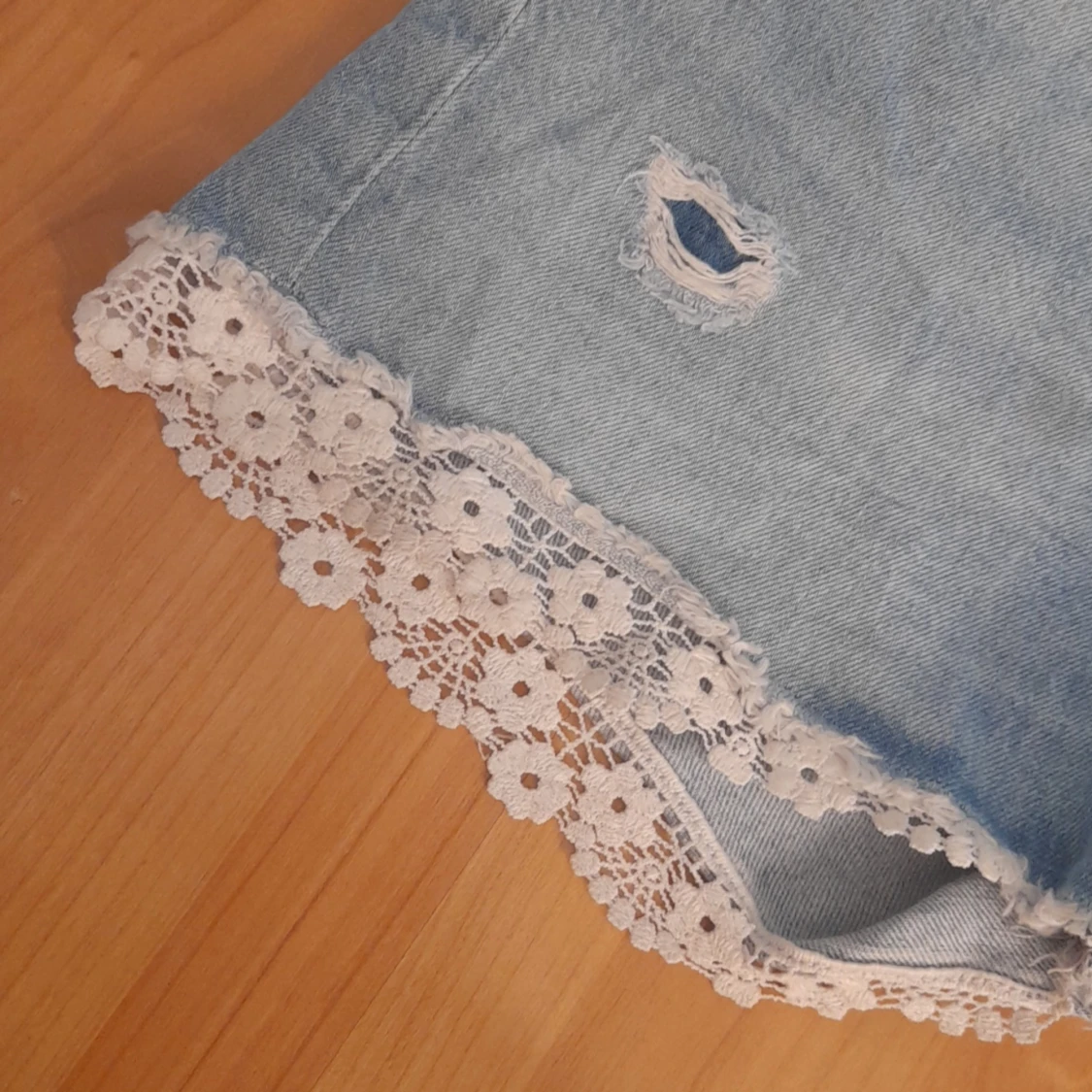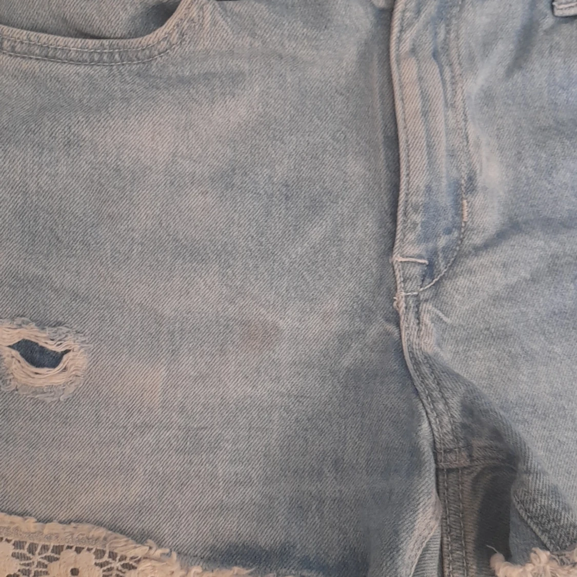 Ett par jätte söta jeans shorts med blommig spets kant ner till och går att dra åt i midjan om man inte vill ha ett skärp. Tyvärr så har den en liten fläk som man ser på sista bilden.