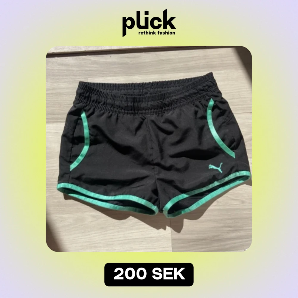 Super snygga svarta lågmidjade/midwaist shorts med turkosa detaljer från Puma som är perfekta att ha till träningen/sport nu till sommaren!⭐️ Man kan justera passformen runt midjan på insidan av shortsen med snören💗Endast använda 1 gång, Nyttskick!⭐️