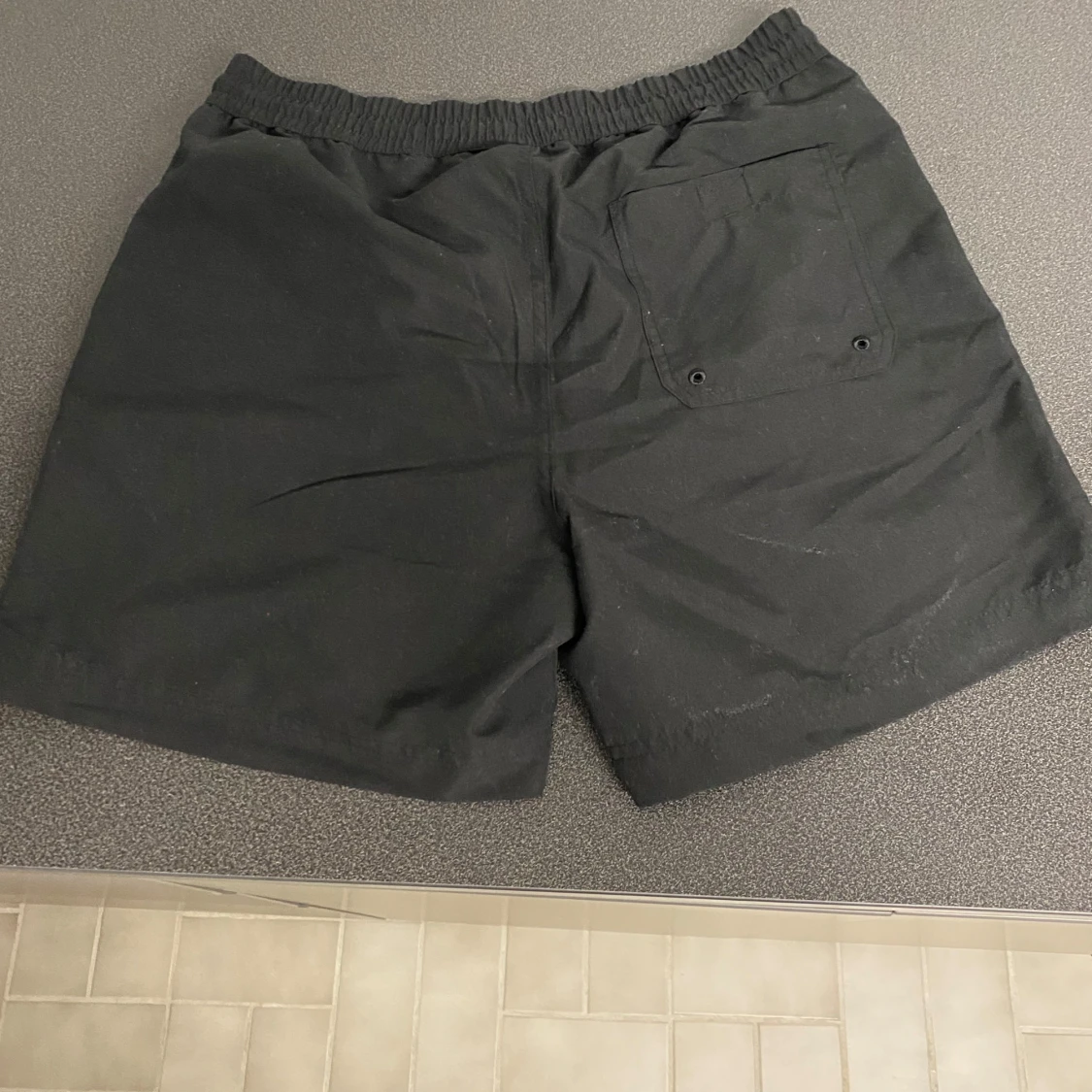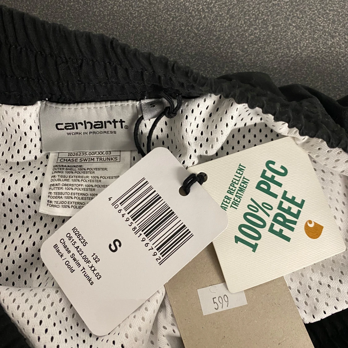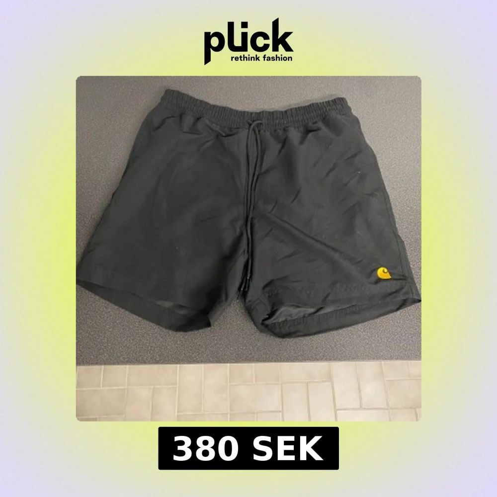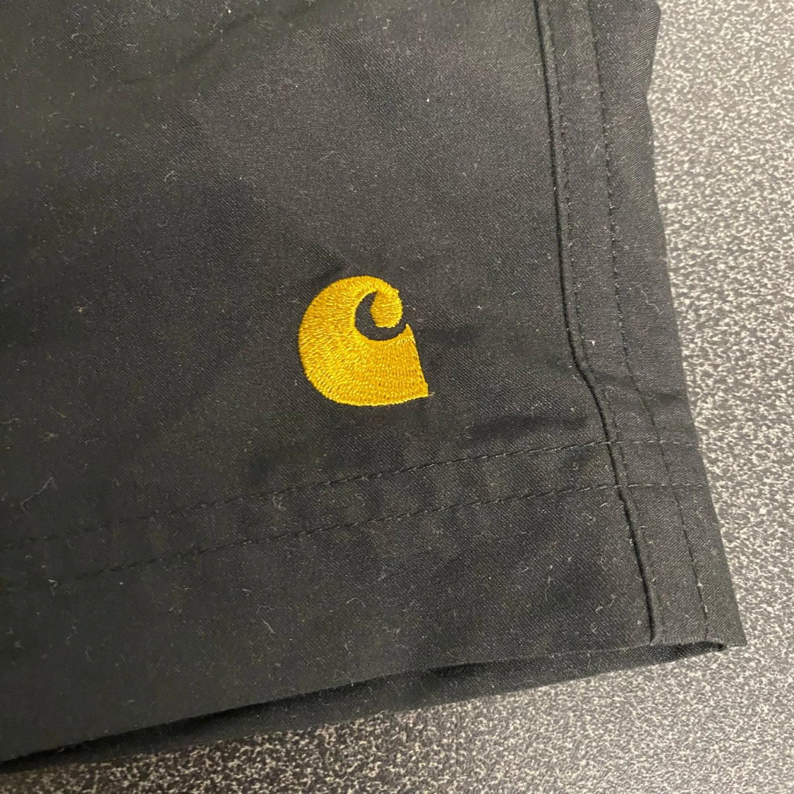 Snygga svarta badshorts från Carhartt med gul broderad logga. De har en elastisk midja med snörning och en bakficka. Perfekta för sommarens badäventyr!