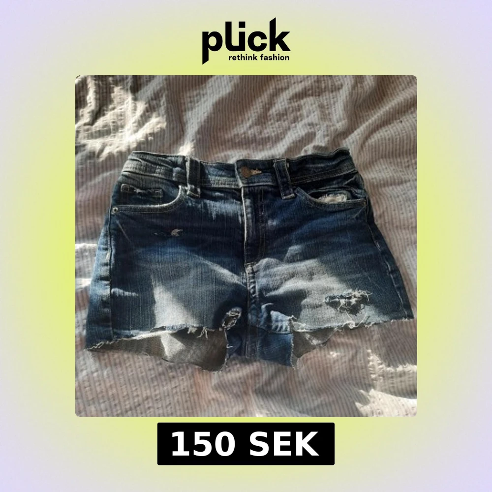 Snygga mörkblå jeansshorts med råa, fransiga kanter och slitna detaljer framtill. Klassisk femficksmodell med knapp och dragkedja. Perfekta för sommardagar när du vill ha en avslappnad och cool stil. klippta hemma
