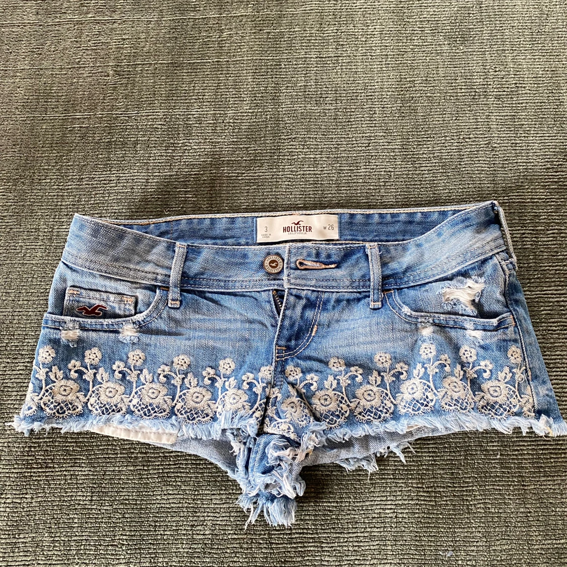 Säljer dessa lågmidjade jeans shorts från hollister med broderade blommor Midjemått: 39 cm