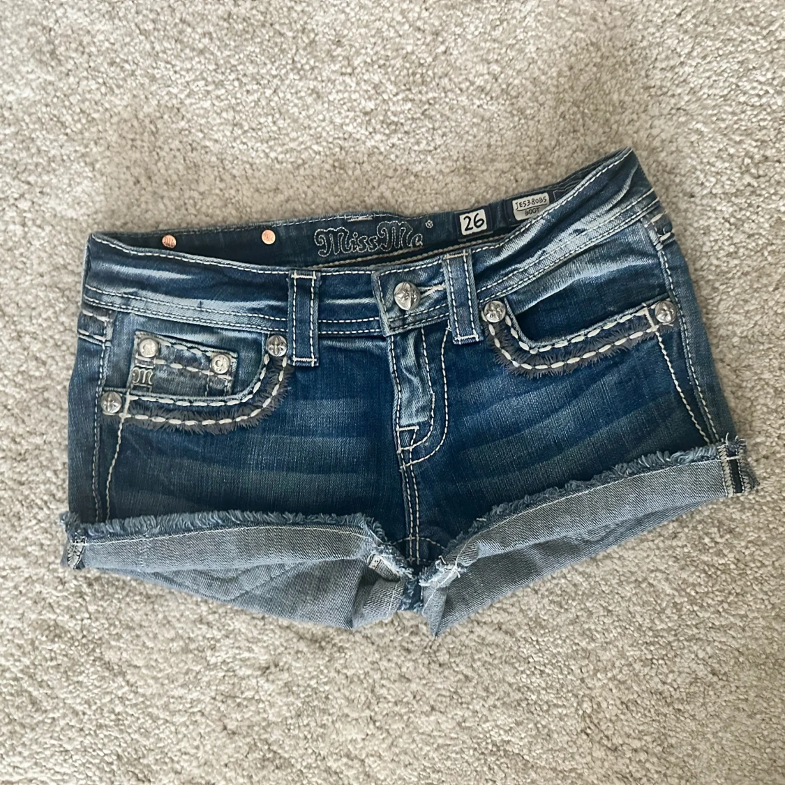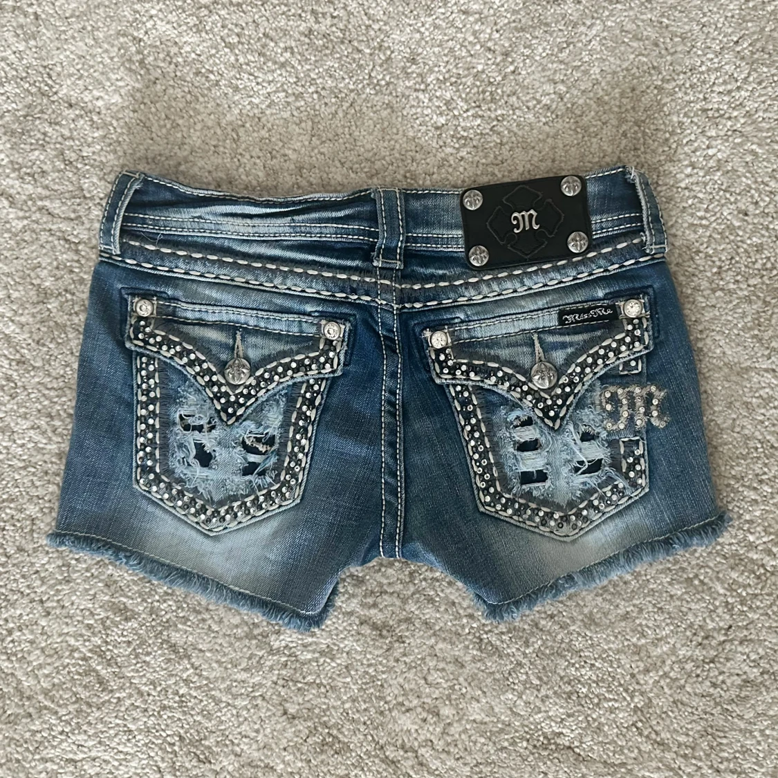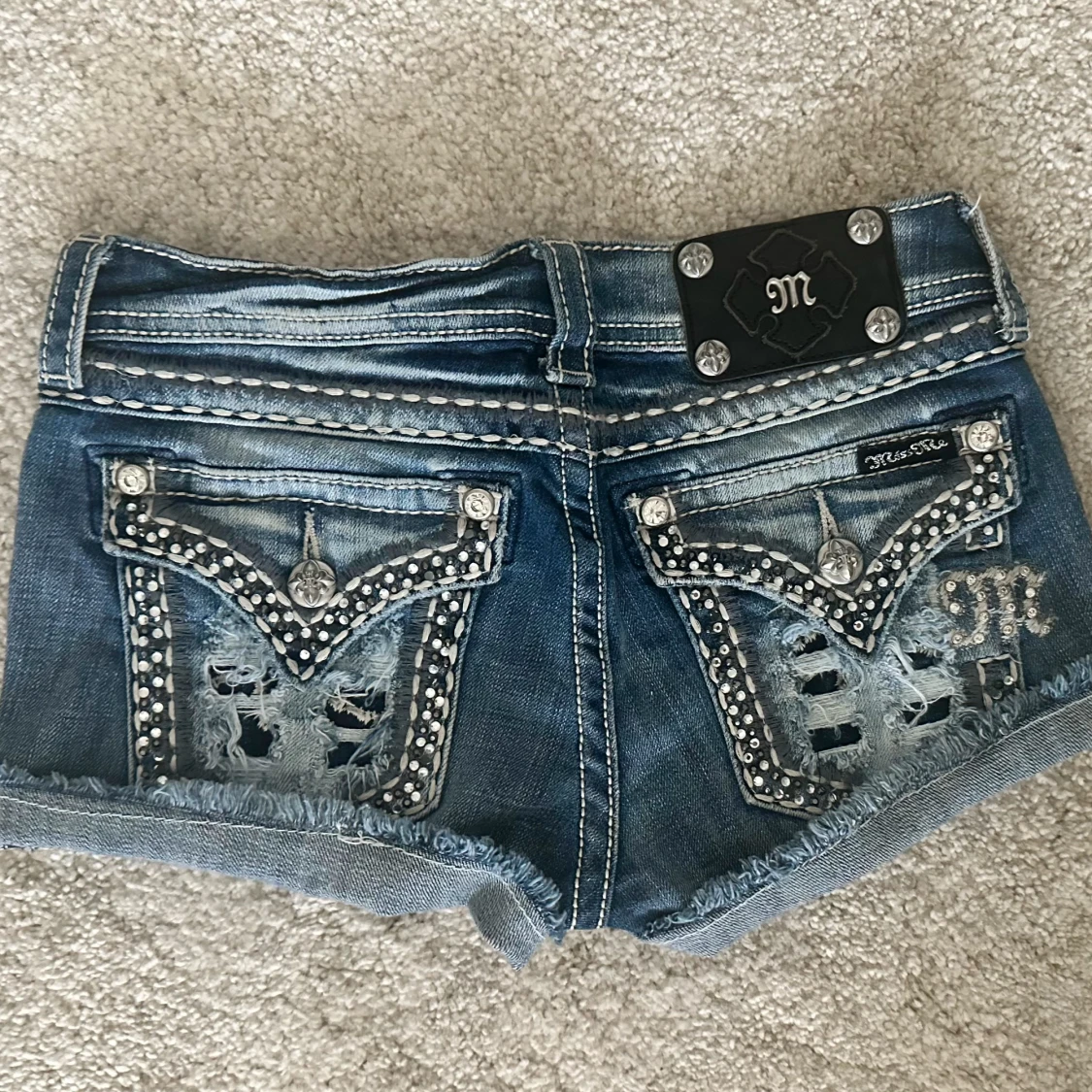 Snygga blå jeansshorts från Miss Me med slitna detaljer, råa kanter och blingade bakfickor med strass och broderier. Shortsen har låg midja, dekorativa sömmar och coola nitar. Perfekta för dig som vill sticka ut med en edgy och glam stil. Midjemått: 72cm 💞