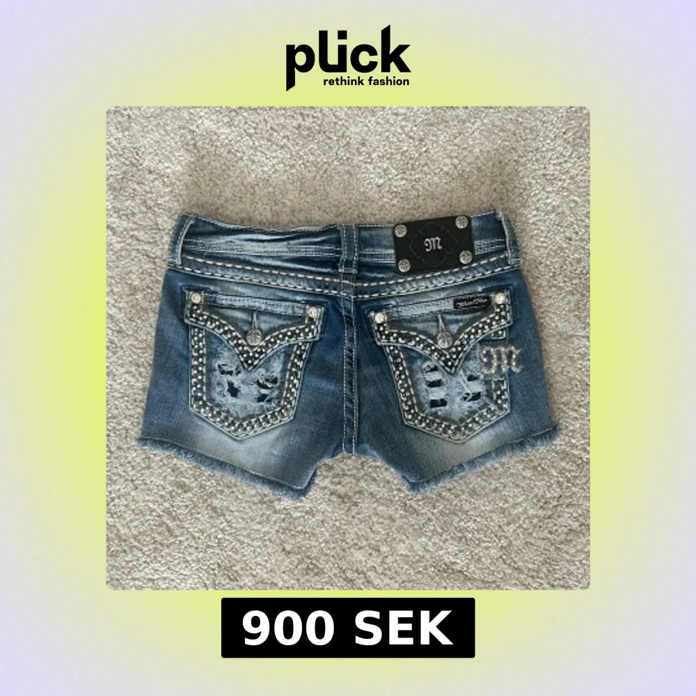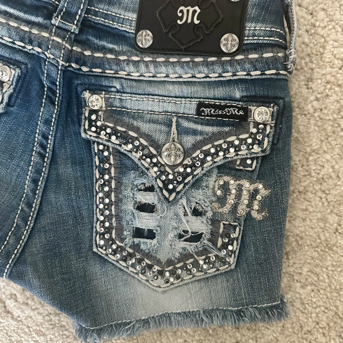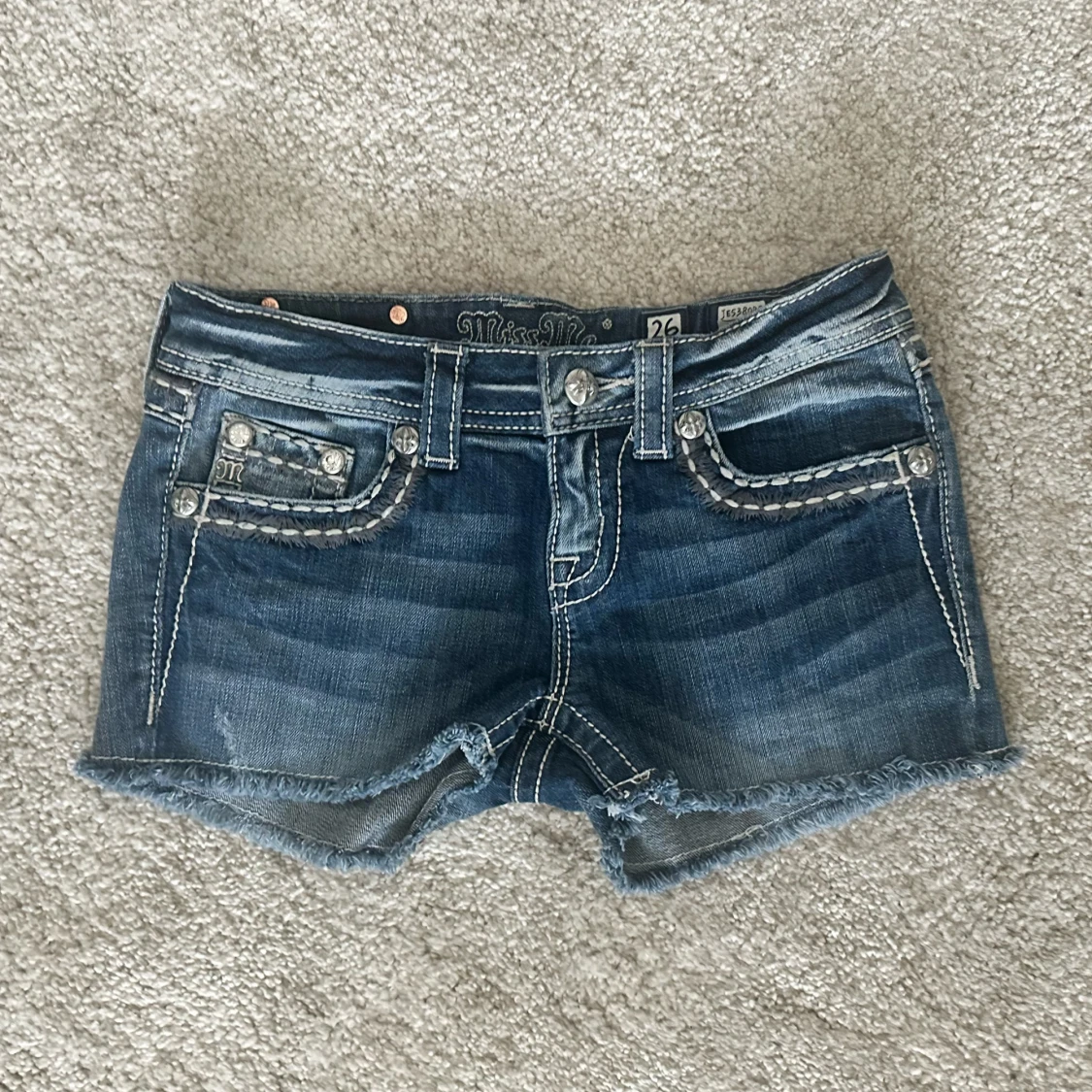 Snygga blå jeansshorts från Miss Me med slitna detaljer, råa kanter och blingade bakfickor med strass och broderier. Shortsen har låg midja, dekorativa sömmar och coola nitar. Perfekta för dig som vill sticka ut med en edgy och glam stil. Midjemått: 72cm 💞