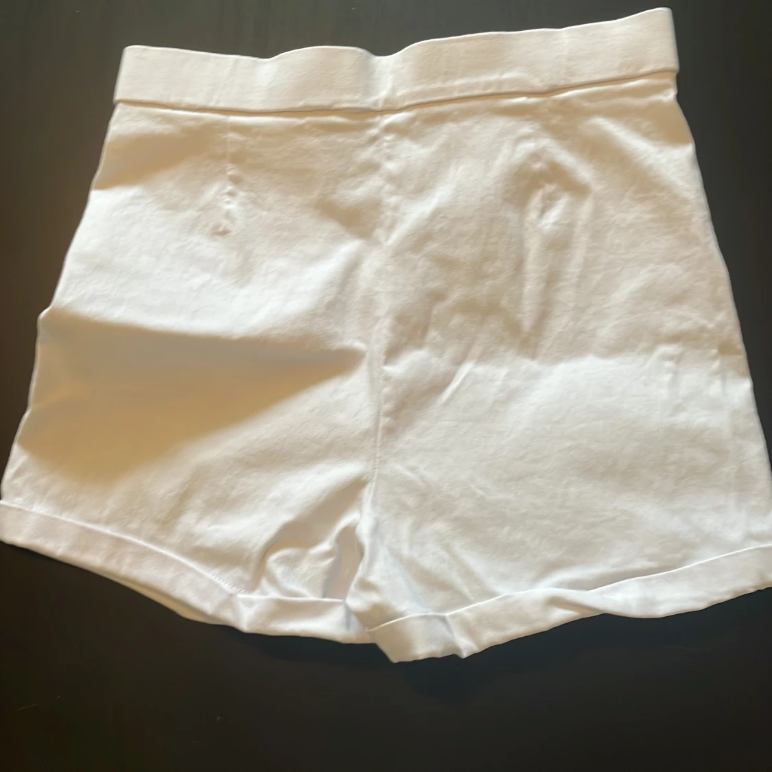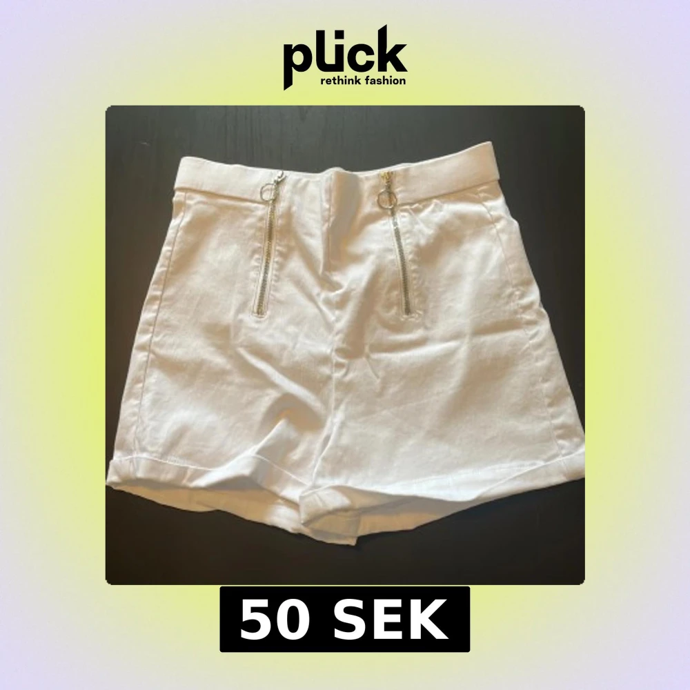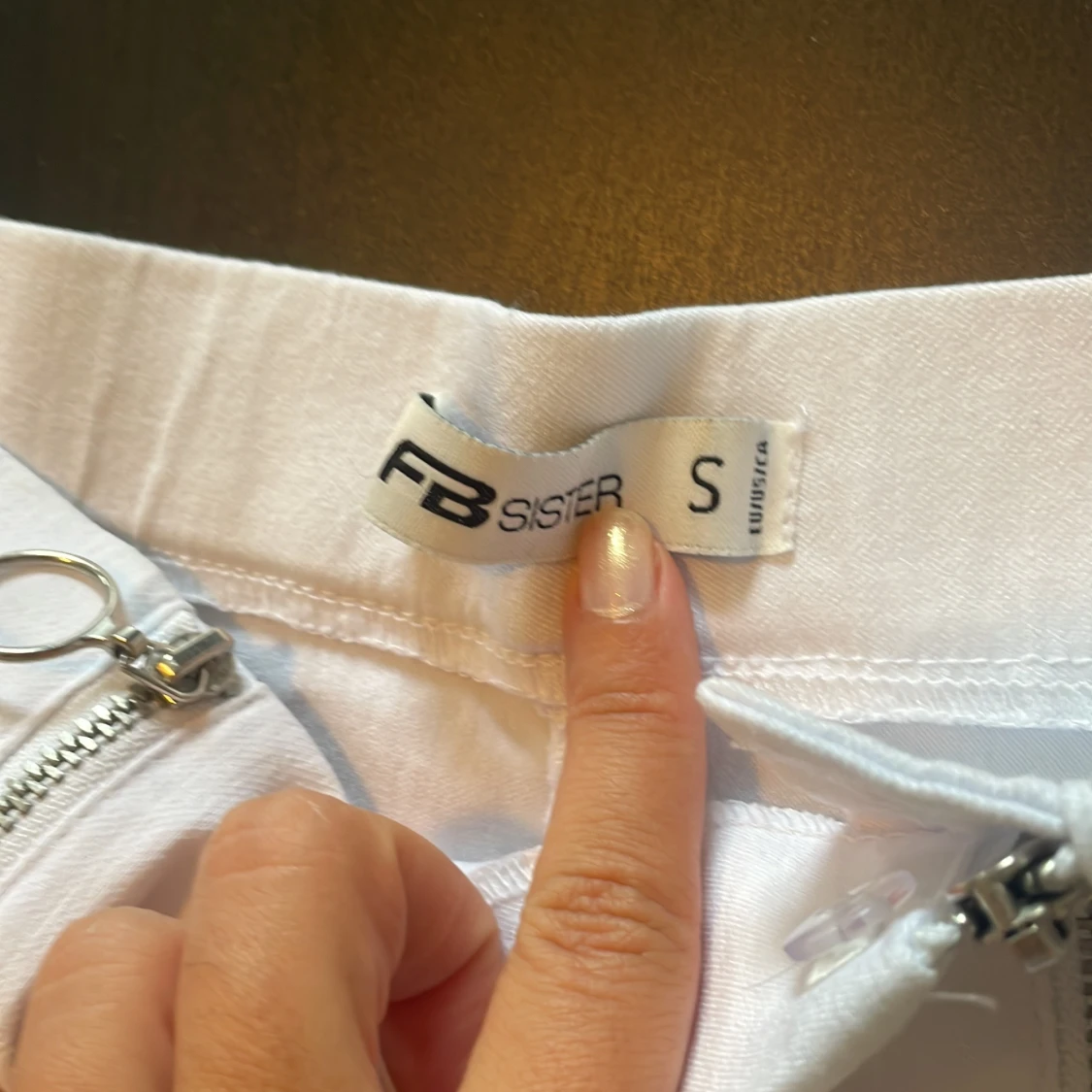 Snygga vita shorts från FB Sister i storlek S. De har hög midja och två coola silverfärgade dragkedjor framtill med ringdetaljer. Materialet känns som bomull och shortsen har en clean, stilren look med uppvikta benslut. Perfekta för sommardagar!
