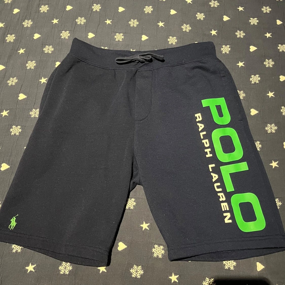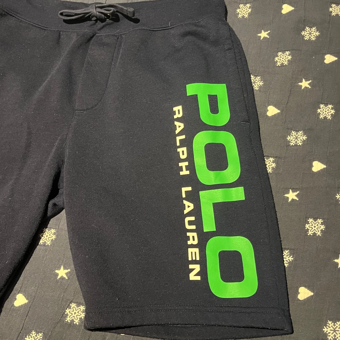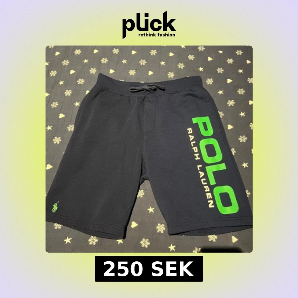 Marinblåa shorts från Polo Ralph Lauren med stor grön logga längs benet och broderad grön polospelare på ena benet. Modellen har snörning i midjan, fickor fram och en bakficka. Mjukt bomullsmaterial och loose fit. Hör jättegärna av dig vid frågor eller funderingar :)