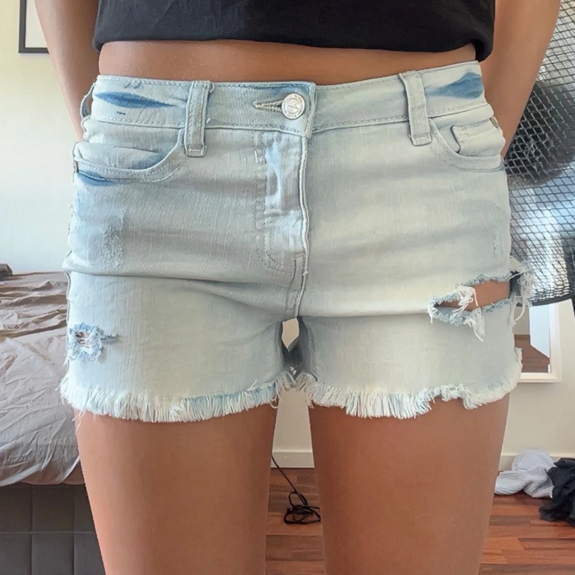 Snygga ljusblå jeansshorts med fransig kant och slitna detaljer framtill. Klassisk femficksmodell med knapp och dragkedja. Perfekta för varma dagar och ger en avslappnad vibe. Aldrig använda och i nyskick!